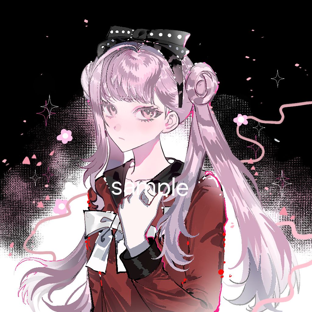 1girlblack sailor collarbowbowtieclosed mouthexpressionlesseyelashesflowerhand upjt dadilong hairlong sleevespink eyespink flowerpink hairred shirtsailor collarsailor shirtsample watermarkshirtsingle sidelocksolosparkletwintailsupper bodywatermarkwhite bowwhite bowtie