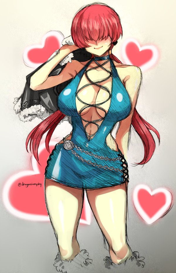1girlbreastscurvydressearringsfemale focusfishnetsfluffyhearthuge breastsjacketjewelrylarge breastslong hairno brapale skinred hairshiny clothesshiny skinskirtsmilesmiley facethick thighsthighstwintailsundressing