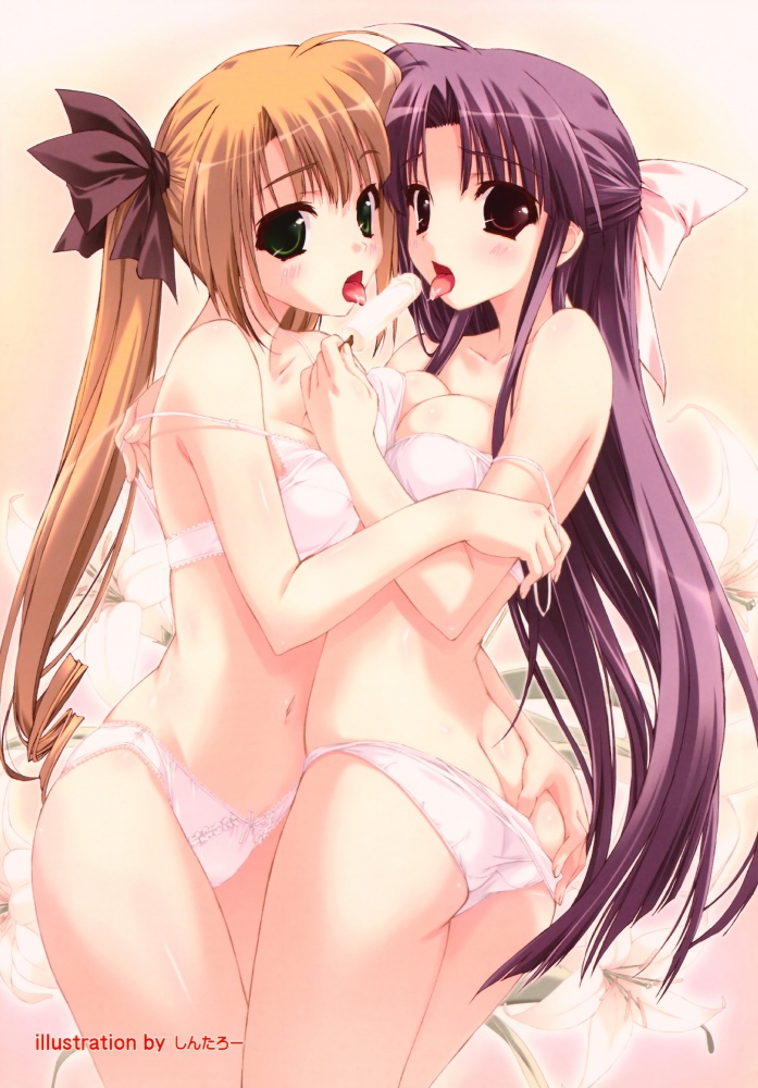 2girlsassasymmetrical dockingblonde hairblushbrabreast pressbreastsbrown eyesflowerfoodgrabbing another's assgreen eyesgropinglickinglingerielong hairmedium breastsmultiple girlsnavelpantiespink brapink pantiesponytailpopsiclepurple hairribbonsalivatongueunderwearunderwear onlyvery long hairyuri