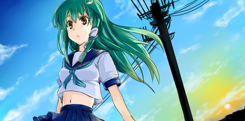1girlalternate costumecontemporarydayfemale focushair tubesmidriffpower linesschool uniformserafukusingle hair tubeskysolo