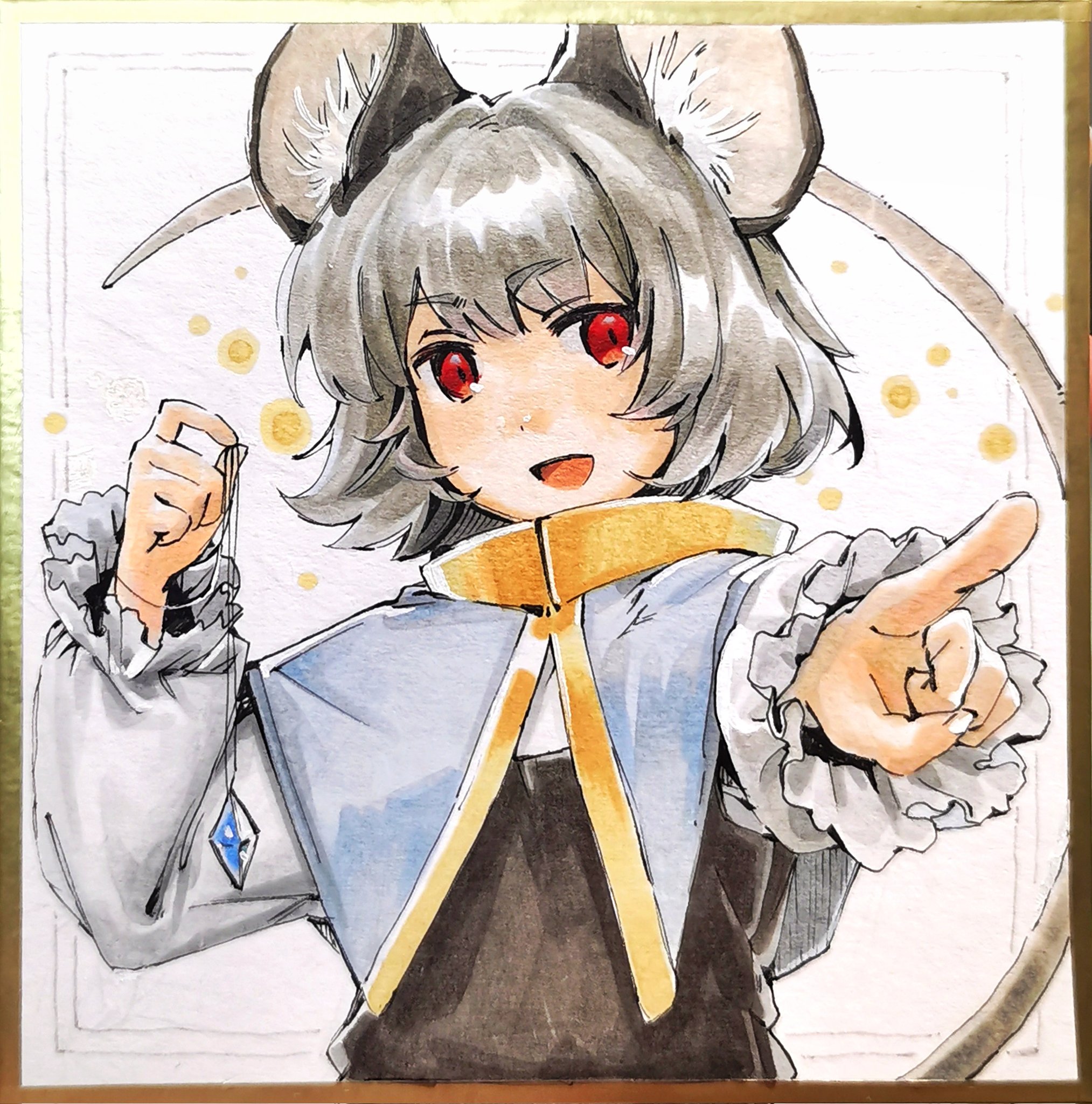 :d1girlanimal earscapeletfrilled sleevesfrillsgrey hairholdingholding jewelryholding necklacejewelrymouse earsmouse tailnecklaceopen mouthpointingportraitred eyesshort hairsmilesolotailwhite background