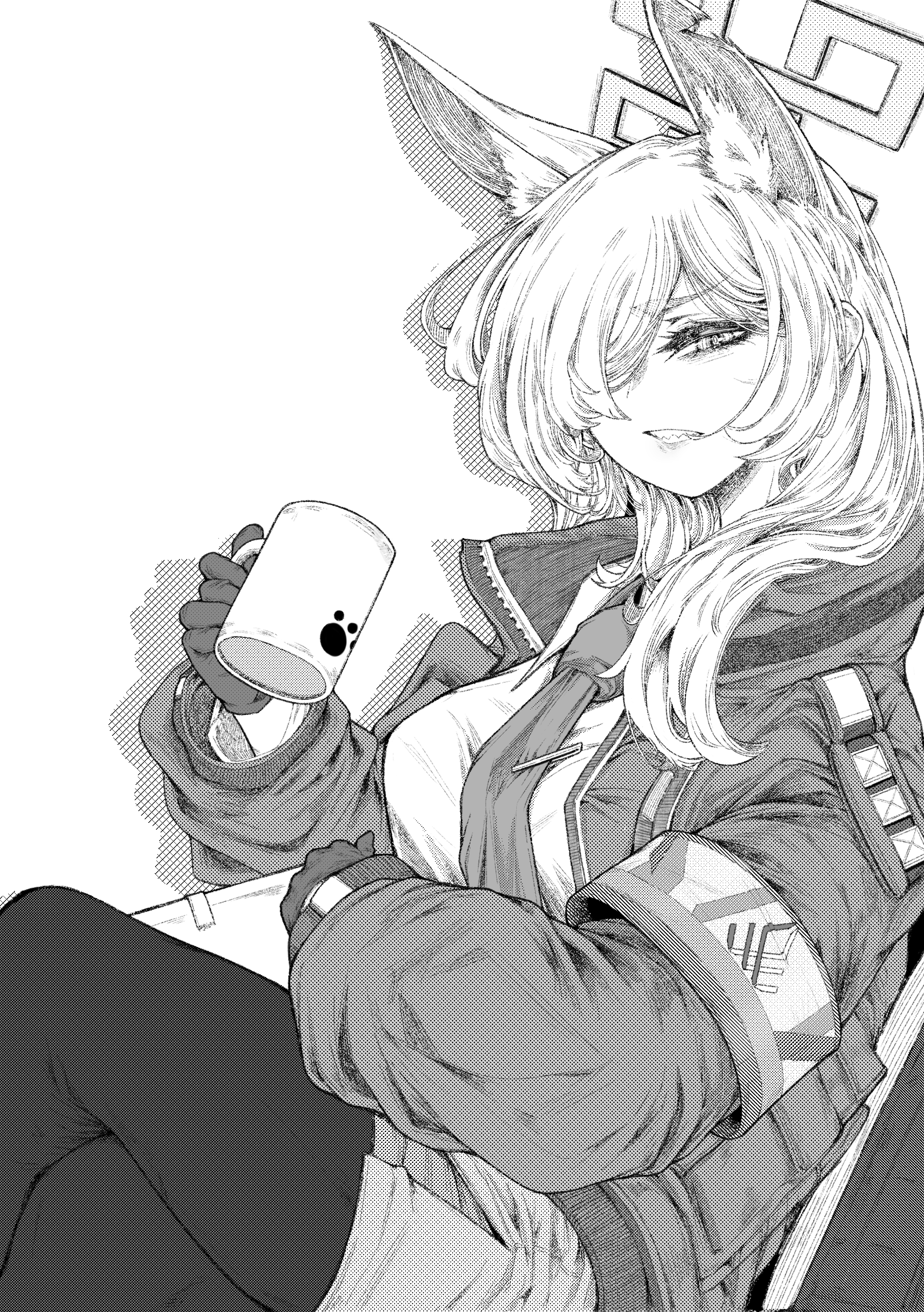 1girlanimal ear fluffanimal earsarmbandbreastscrossed legscupdog earsdog girlextra earseyelashesgreyscalehair over one eyehaloholdingholding cupjacketlarge breastslong hairlooking at viewermonochromenecktienotched earpantyhoseparted lipspaw printpencil skirtpolicepolice uniformpolicewomansharp teethshirtsimple backgroundsittingskirtsoloteethwhite background