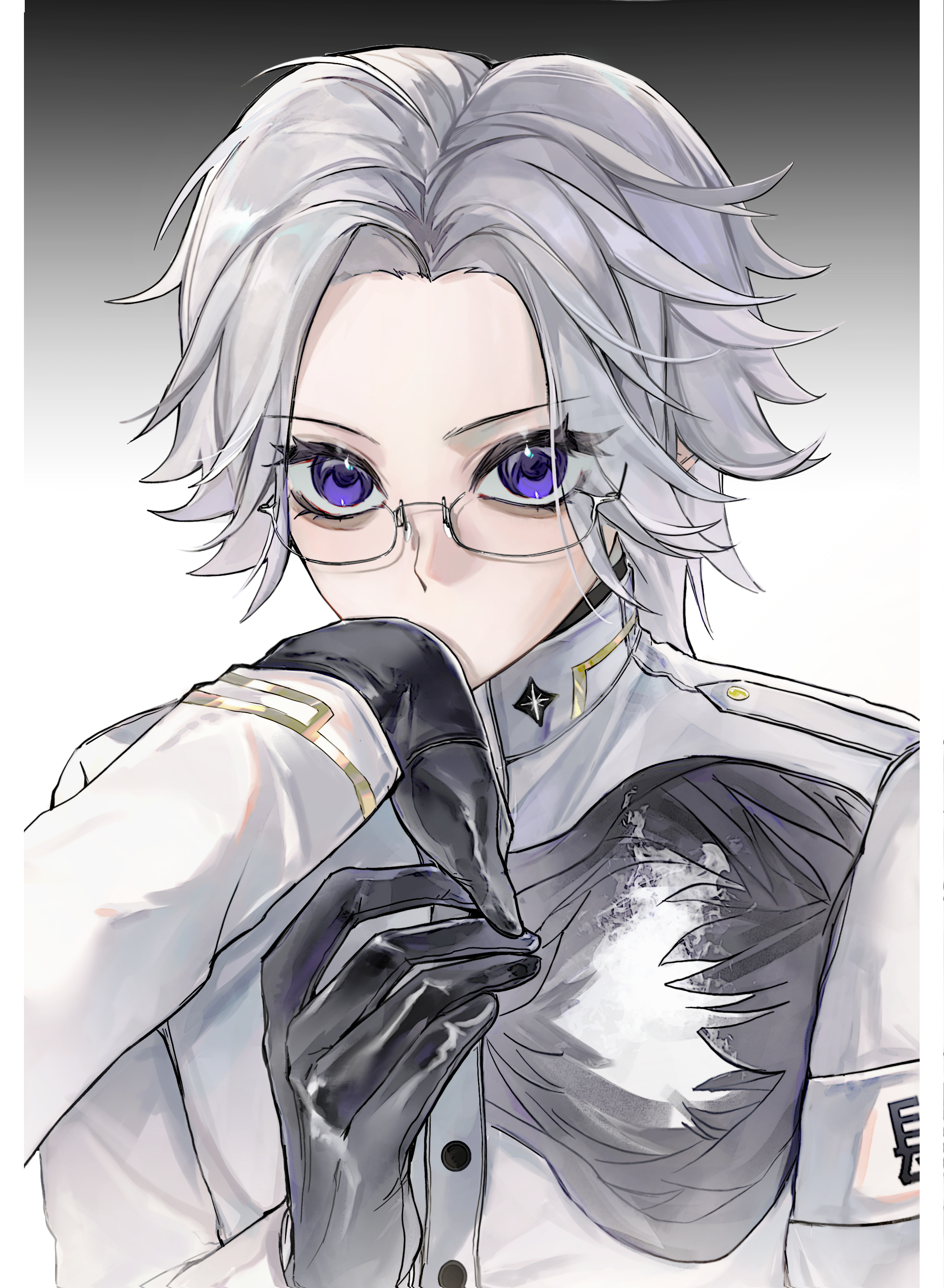 2boysarmbandbags under eyesblack glovesblue eyesbuttonscurtained hairdinglieyelasheseyes visible through hairglassesglovesgradient backgroundgrey hairhigh collarhole in chesthole on bodyjacketkisskissing handlong sleevesmale focusmultiple boysofficial alternate colorsanpakusemi-rimless eyewearshort hairsolo focuswhite armbandwhite jacketwhite-framed eyewearyaoi