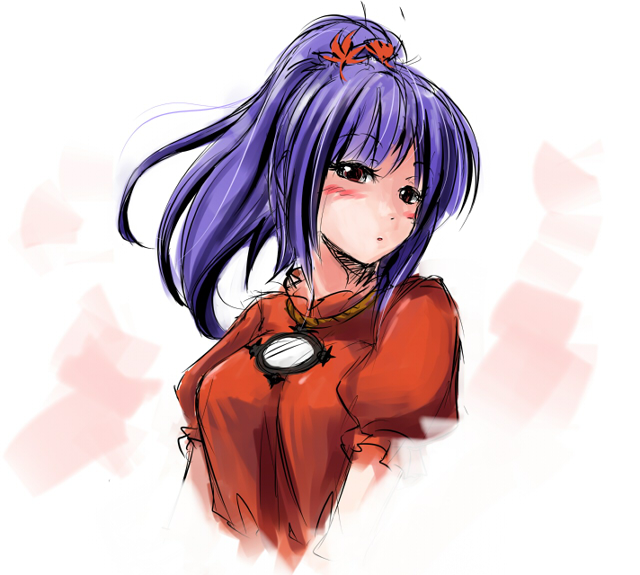 1girlalternate hairstyleblushbreastsfemale focusponytailpurple hairsketchsoloupper bodywhite background