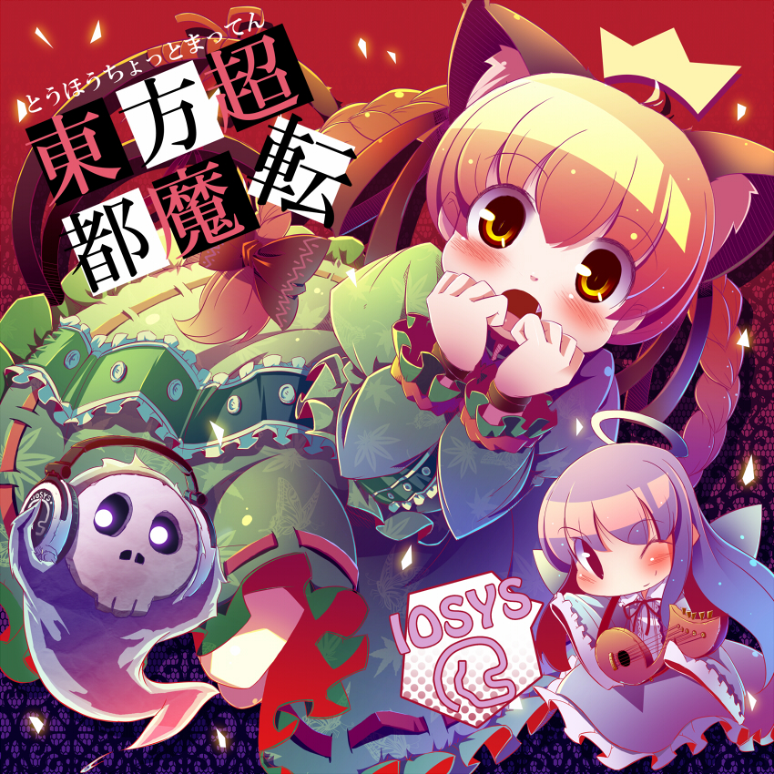 sesmkun, flandre scarlet, touhou, absurdres, commentary, highres, 1girl, blonde hair, character name, crystal, crystal wings, dated commentary, dress, frilled sleeves, frills, from side, hat, mob cap, multicolored wings, one side up, pointy ears, puffy short sleeves, puffy sleeves, red dress, red eyes, short sleeves, sitting, solo, white hat, wings
