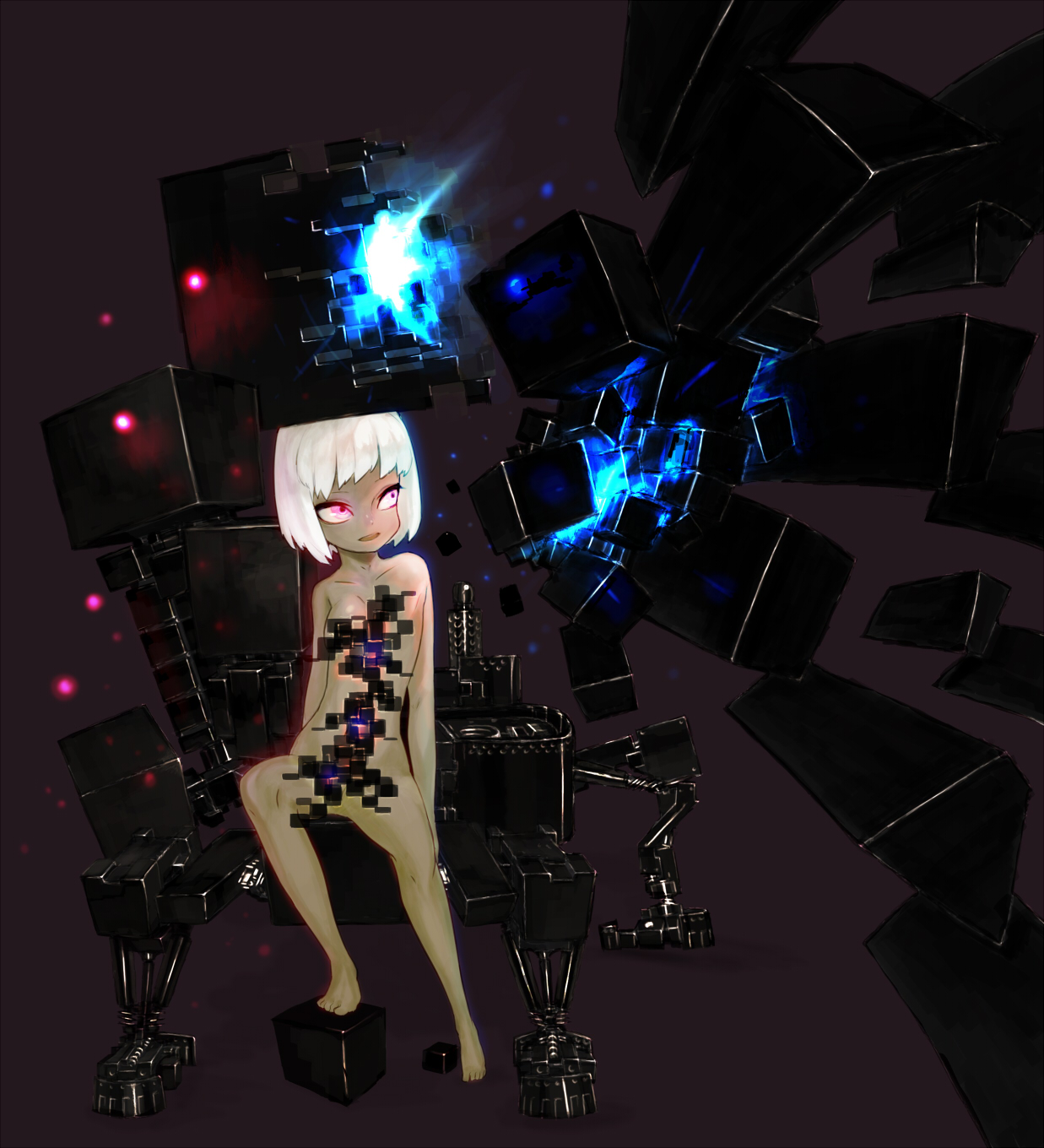 1girlbarefootcensoredconvenient censoringdarkfemale focusflat chestmechanudered eyesrobotsolowhite hair