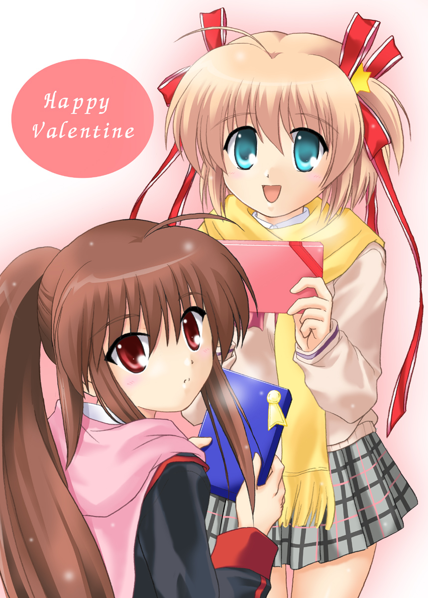 2girlsaqua eyesblonde hairboxbrown hairhappy valentinelong hairmultiple girlsopen mouthponytailred eyesscarfschool uniformshort hairvalentine