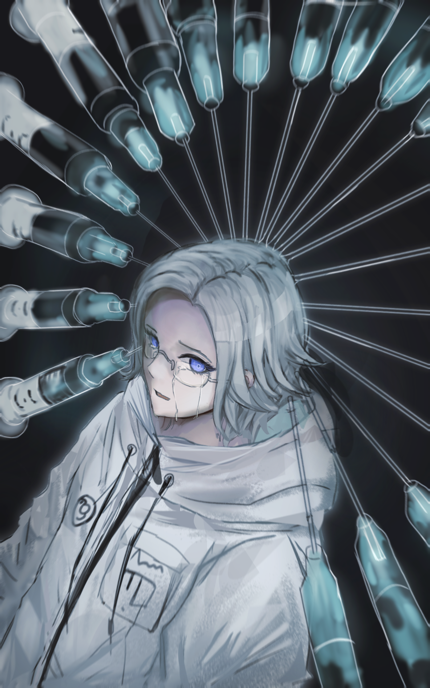 1boyblack backgroundblack glovesblue eyescryingcrying with eyes opendong fanqiedrawstringeyelashesforeheadglassesglovesgrey hairgrey-framed eyewearhoodhood downhooded jacketjacketlong sleevesmale focusopen mouthpocketshort hairsolosyringetearsupper bodywhite jacketzipper pull tab