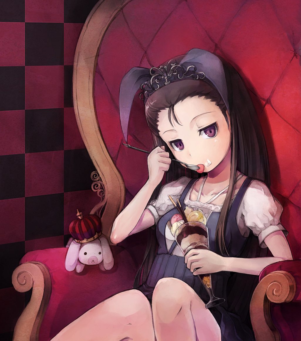 00s1girlarmchairbrown hairchaircrowneatingfemale focusfoodhairbandice creamlong hairparfaitpockyrabbitred upholsteryribbonsittingsolostuffed animalstuffed rabbitstuffed toysundaetiara