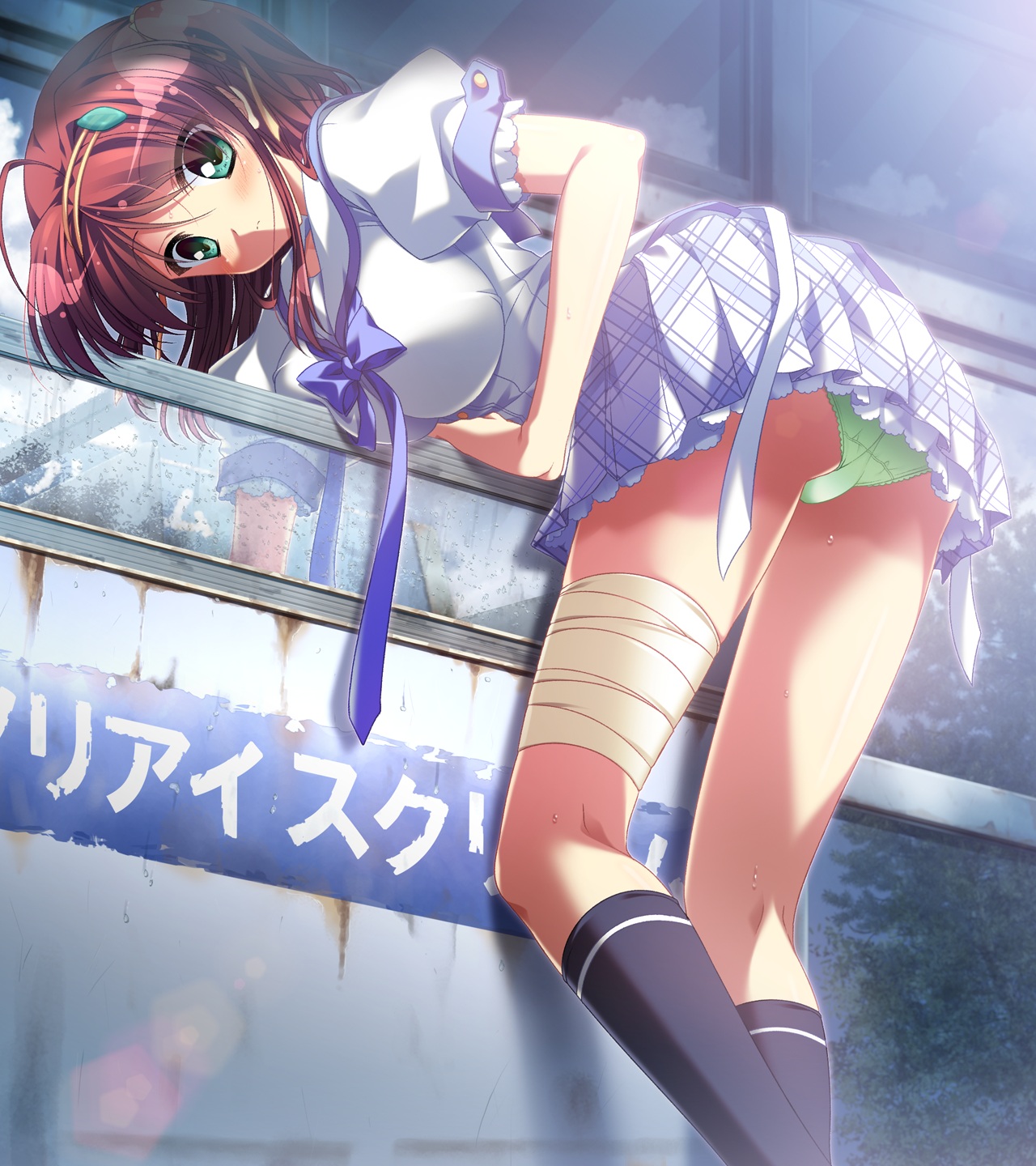 kuroda kazuya, original, 1girl, bag, black thighhighs, blouse, blush, breasts, brown eyes, brown hair, cameltoe, covered erect nipples, female focus, handbag, large breasts, open clothes, open shirt, panties, pantyshot, school uniform, serafuku, shirt, solo, thighhighs, underwear, weapon