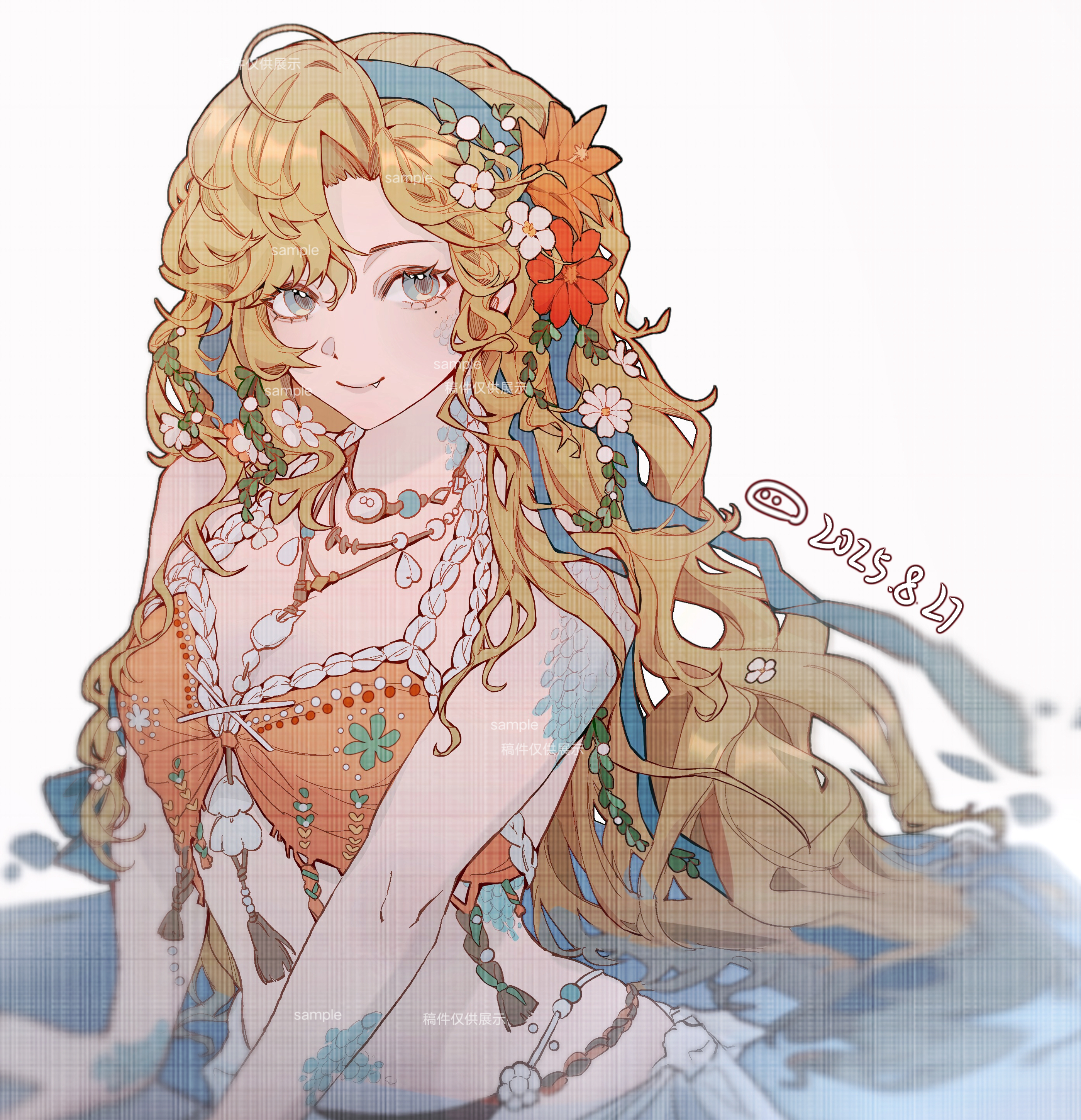 1girlbikiniblonde hairblue eyesblue hairbandbreastsclosed mouthdatedflowerhair flowerhair ornamenthairbandjewelrylarge breastslong hairmolemole under eyenecklaceofficial alternate costumeorange bikiniorange flowerred flowerscalessmilesoloswimsuitupper bodyvery long hairwatermarkwhite backgroundyiyi jiang si le