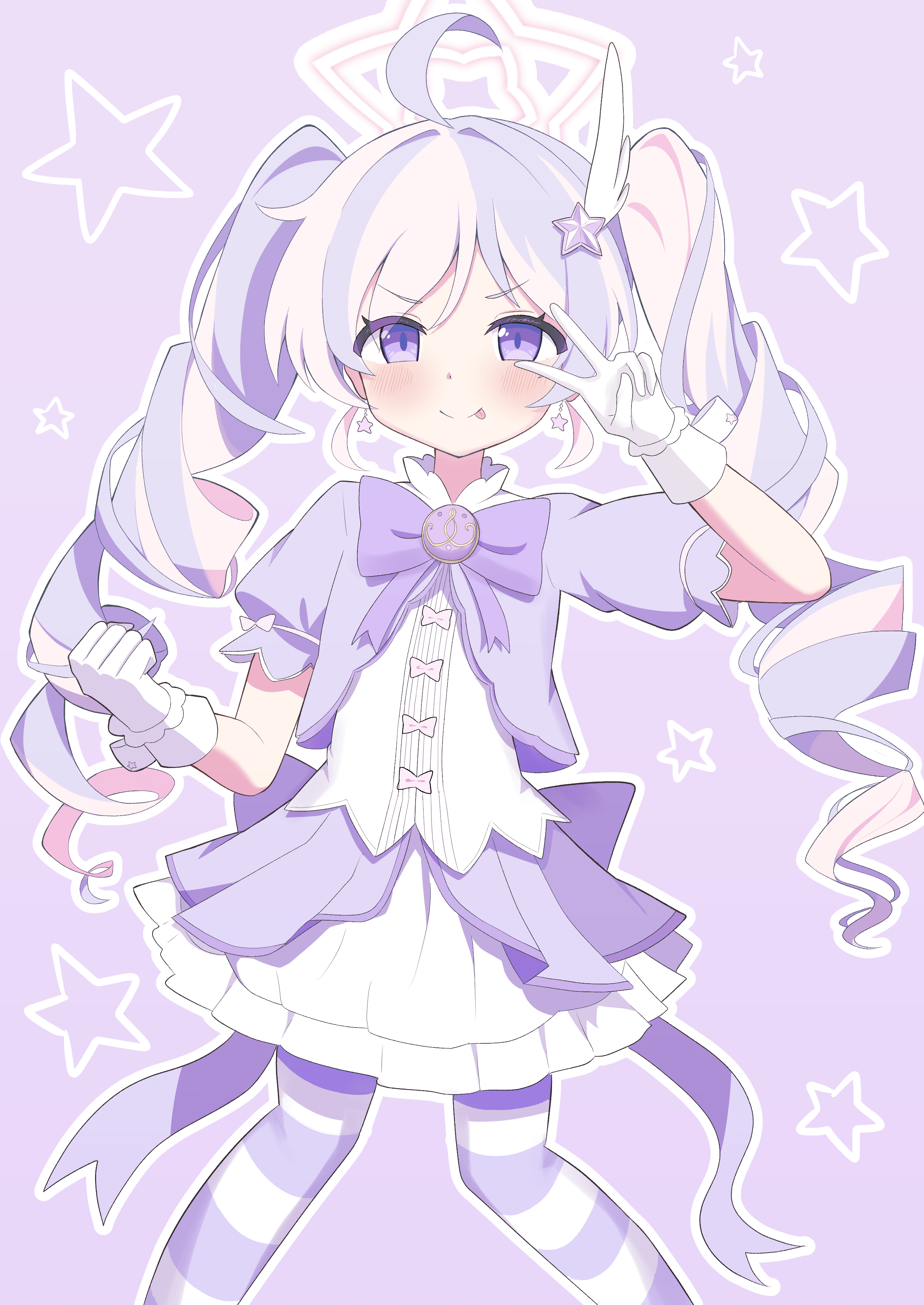 :p1girlahogebowbowtieclosed mouthdressdrill hairgloveshair ornamenthalolooking at viewermagical girlmulticolored hairpantyhosepink hairpink halopuffy short sleevespuffy sleevespurple bowpurple bowtiepurple eyespurple hairpurple pantyhoseshort sleevessolostar (symbol)star hair ornamentstar halostriped clothesstriped pantyhosetonguetongue outtwin drillstwintailstwo-tone hairvwhite gloves