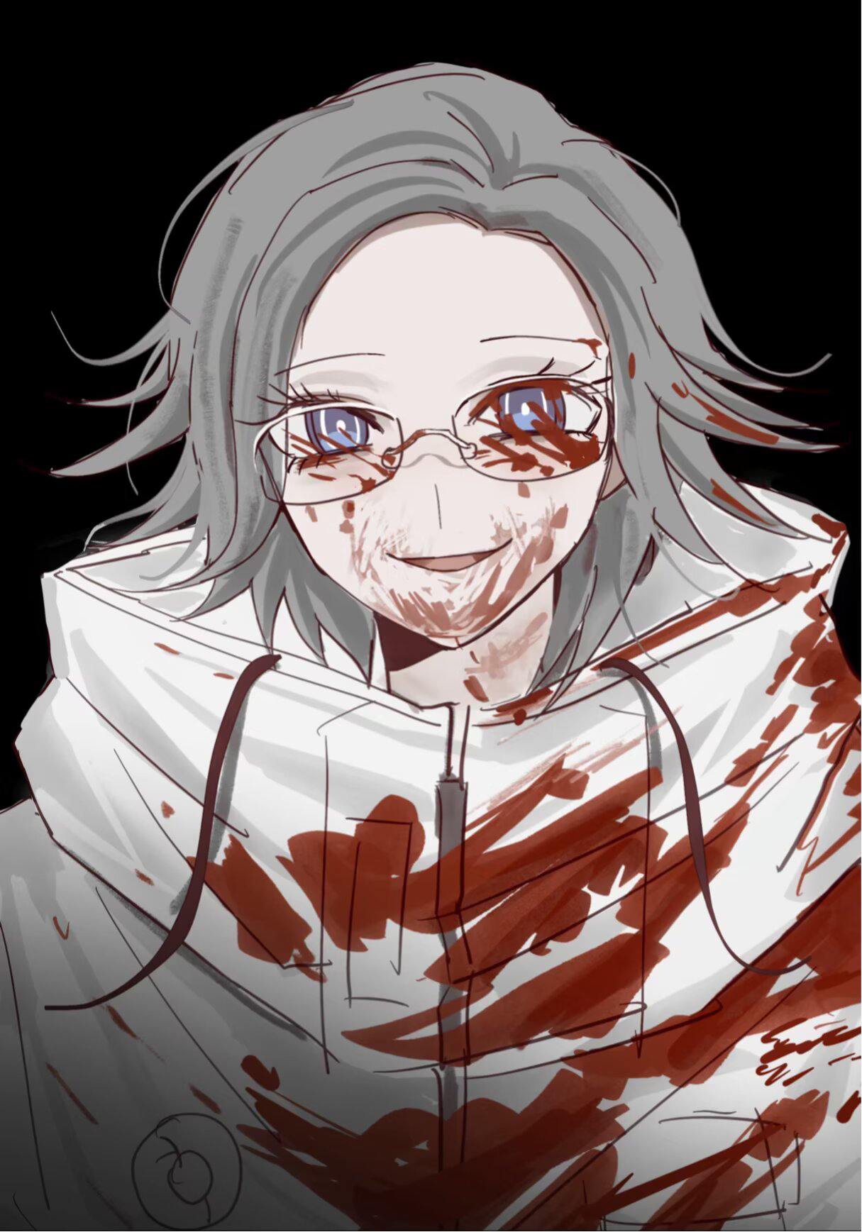 1boyblack backgroundbloodblood on clothesblood on eyewearblue eyesevil smileeyelashesglassesgrey hairjacketlooking at viewermale focusshort hairsimple backgroundsmilesolosusushu666upper bodywhite jacket