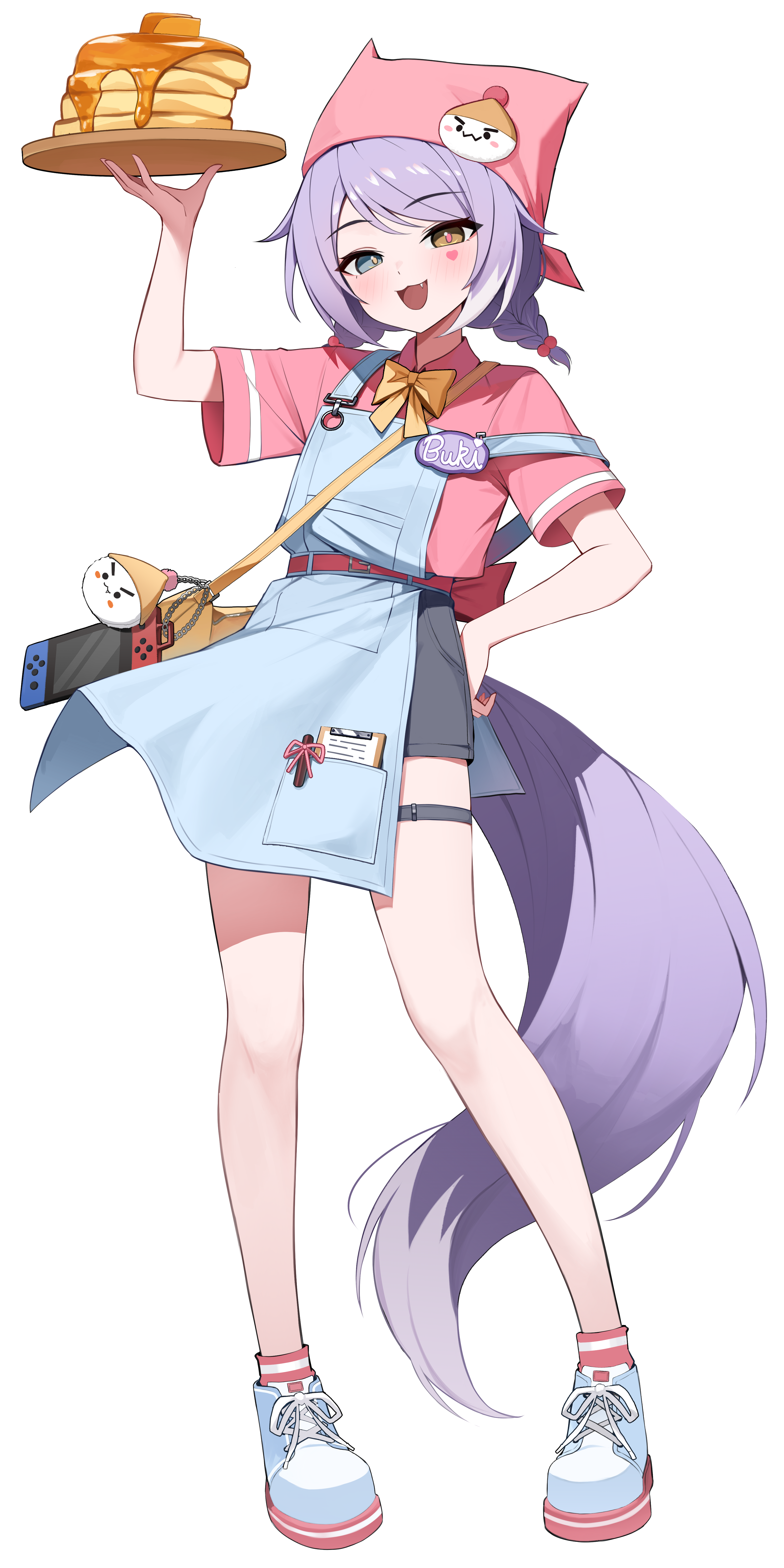 1girlapronarm upbandanablue apronblue eyesblushbowbowtiebraidbrown eyesbutterchaincharacter charmcharm (object)collared shirtcontrappostofangfoodfox girlfox tailfull bodygrey shortshair bobbleshair ornamenthand on own hiphandheld game consoleheartheart stickerheterochromiaholdingholding trayinari (tenko shibuki)looking at viewermedium hairname tagopen mouthorange boworange bowtiepancakepancake stackpigeon-toedpink bandanapink shirtpurple hairpurple tailshirtshoesshort shortsshort sleevesshortssimple backgroundsmilesneakerssolostandingstickersticker on facestrap slipsyruptailthigh straptrayvirtual youtuberwhite backgroundwhite shoeswing collaryireh