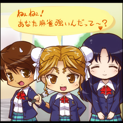 3girlsbaseball batblue hairbun coverchibidark skindark-skinned femaledouble bunmultiple girlsschool uniformshort hairsweatdrop
