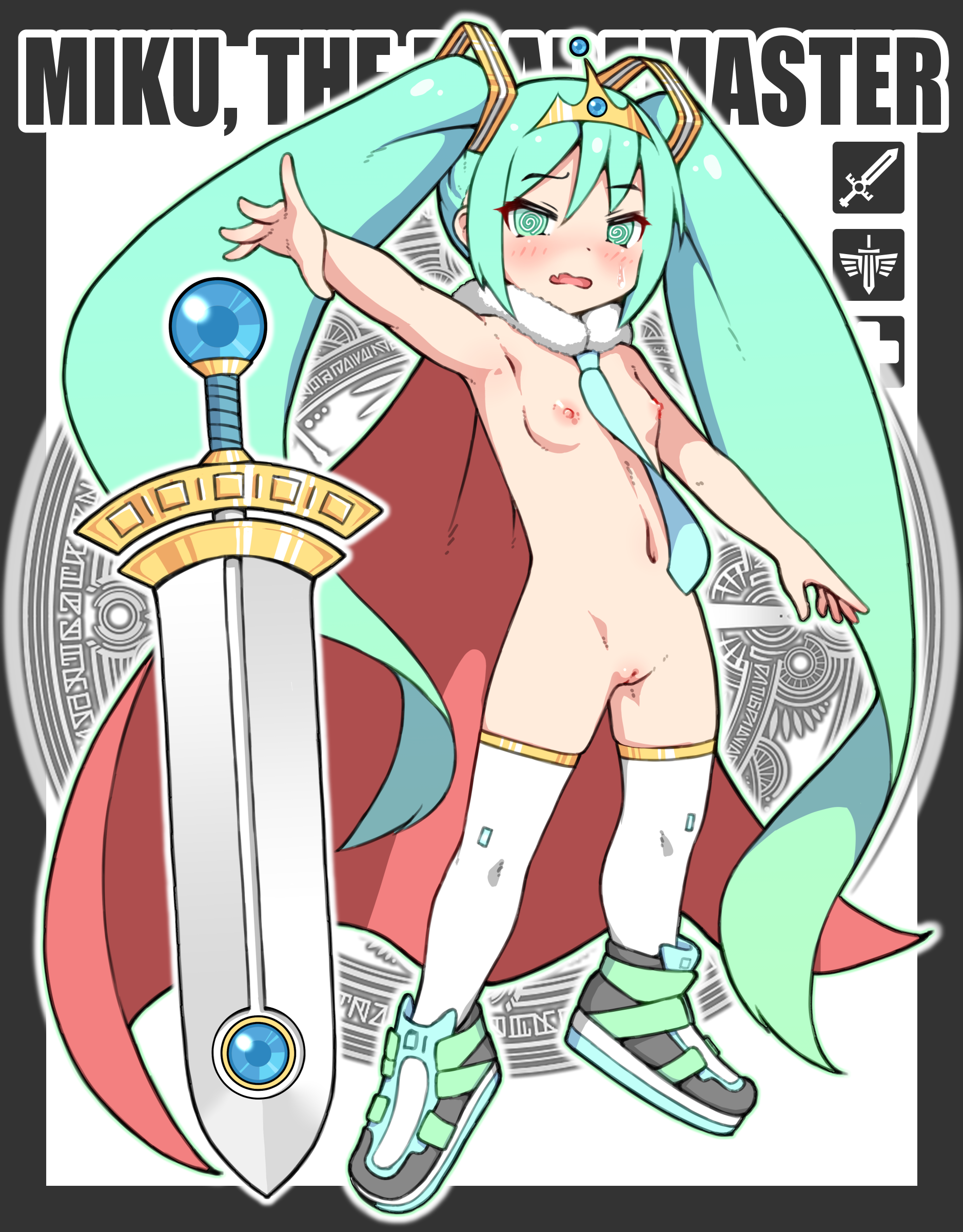1boy1girlblushbreastscapelong hairnavelnecktienipplespussyshoessmall breastssoloswordthighhighstwintailsvery long hairweaponwhite thighhighs