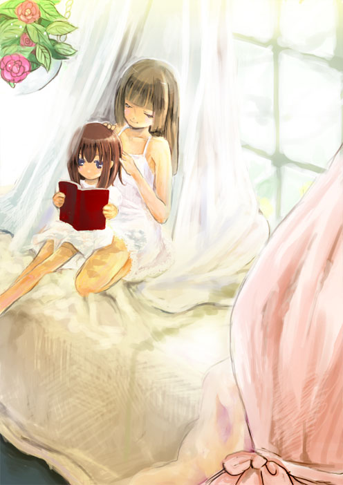 00s2girlsage differencebedblue eyesbookbrown hairchemiseclosed eyescurtainsdressflowerhime cutmother and daughtermultiple girlsopen bookorange hairreadingsittingsmilesundresswindow