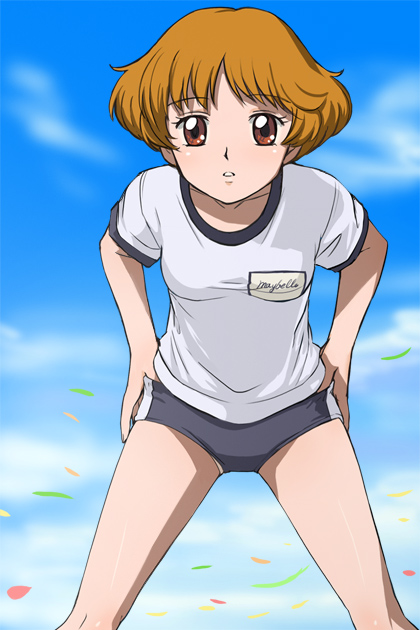 1girladjusting burumaadjusting clothesbreastsbrown eyesbrown hairburumacloudfemale focusgym uniformleaning forwardlooking at viewermedium breastsoutdoorspantiespanty peekparted lipspetalsschoolseparated legsshort hairskysolounderwear