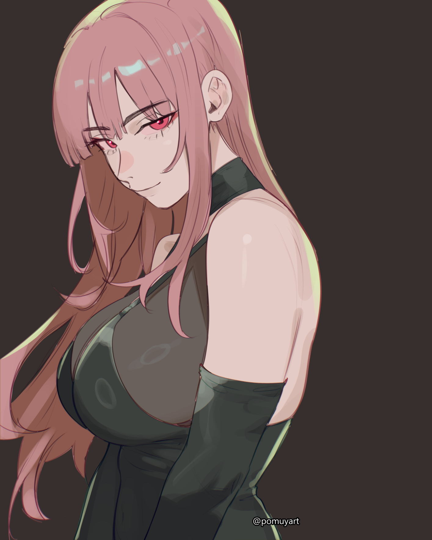 1girlalternate costumeblack dressblunt bangsbreastsclosed mouthdetached sleevesdressfrom sidegrey backgroundlarge breastslong hairlooking at viewerpink eyespink hairsidelockssimple backgroundsleevelesssleeveless dresssmilesoloupper bodyvirtual youtuber
