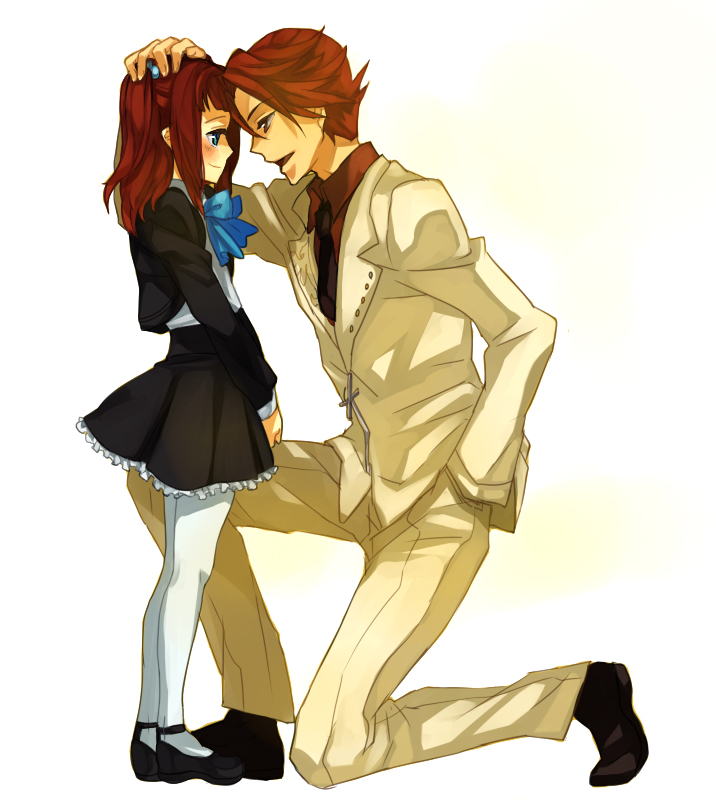 1boy1girlaged downblue hairblushbrother and sistercosplaydressfrederica bernkastel (cosplay)frillshair bobbleshair ornamenthand in pocketheadpatjacketmary janesnecktieon one kneepantyhosepatpattingred hairribbonshoessiblingssmilethighhighstwintails