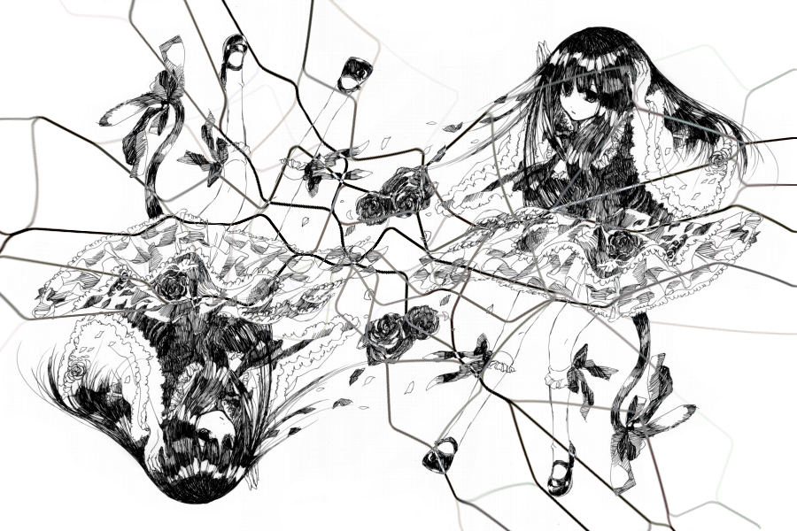 00scat taildressdual personaflowerfrillsgreyscalelong hairmary janesmonochromeribbonroserotational symmetryshoestailupside-down