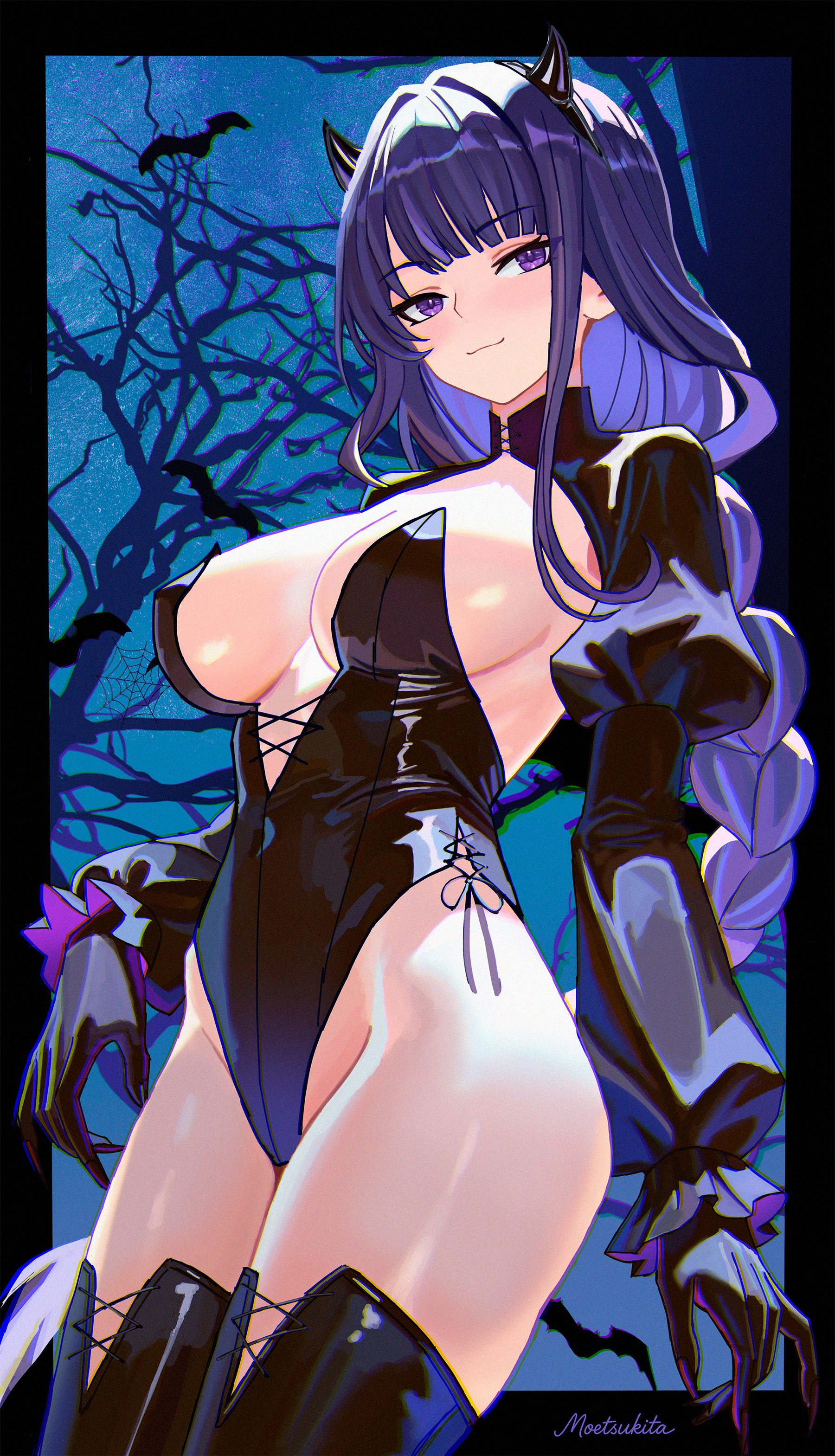 1girlassbodysuitbreastsgloveshair ornamenthalloweenhuge asslarge breastslatexlatex bodysuitlatex gloveslong hairlooking at viewerpale skinpurple eyespurple hairsmug