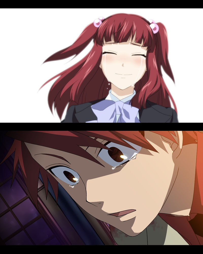 biko, kuwahara rin, biko 3, artist request, game cg, 1boy, 1girl, :o, blue skirt, book, brown eyes, brown hair, detached sleeves, dutch angle, formal clothes, hand on another's shoulder, head out of frame, holding, holding book, long sleeves, parted lips, plaid clothes, plaid skirt, realistic, short hair, skirt, sleeveless, solo focus, suit, upper body, vest
