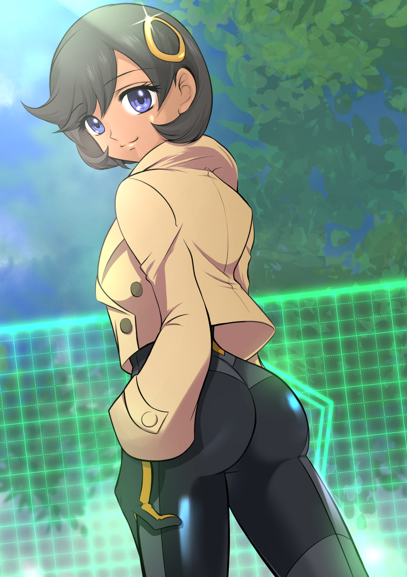 :31girlassblack bodysuitblack glovesblack hairbodysuitbodysuit under clothesbreastsbrown jacketclosed mouthcowboy shotdark skindark-skinned femaledayfrom behindglintgloveshair between eyeshair ornamentjacketlatexlatex bodysuitlooking at viewermedium breastsorange glovesoutdoorspokemon (creature)purple eyesshort hairsidelockssmilesolostandingswept bangs