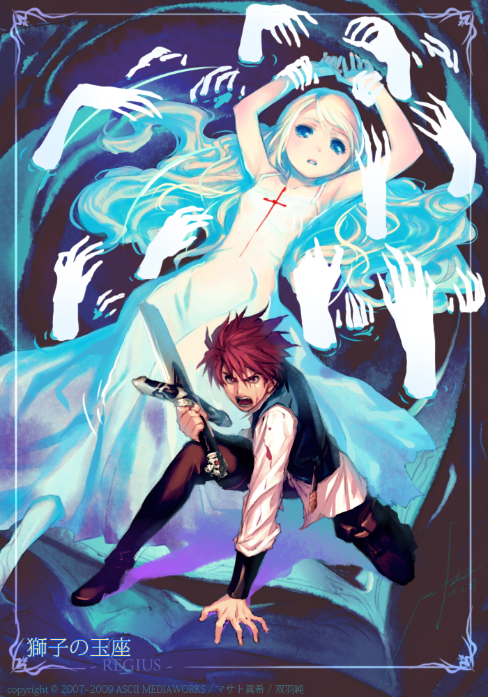 blonde hairbloodblue eyesbrokenbroken swordbroken weapondressflat chestswordwaterweaponwhite dress