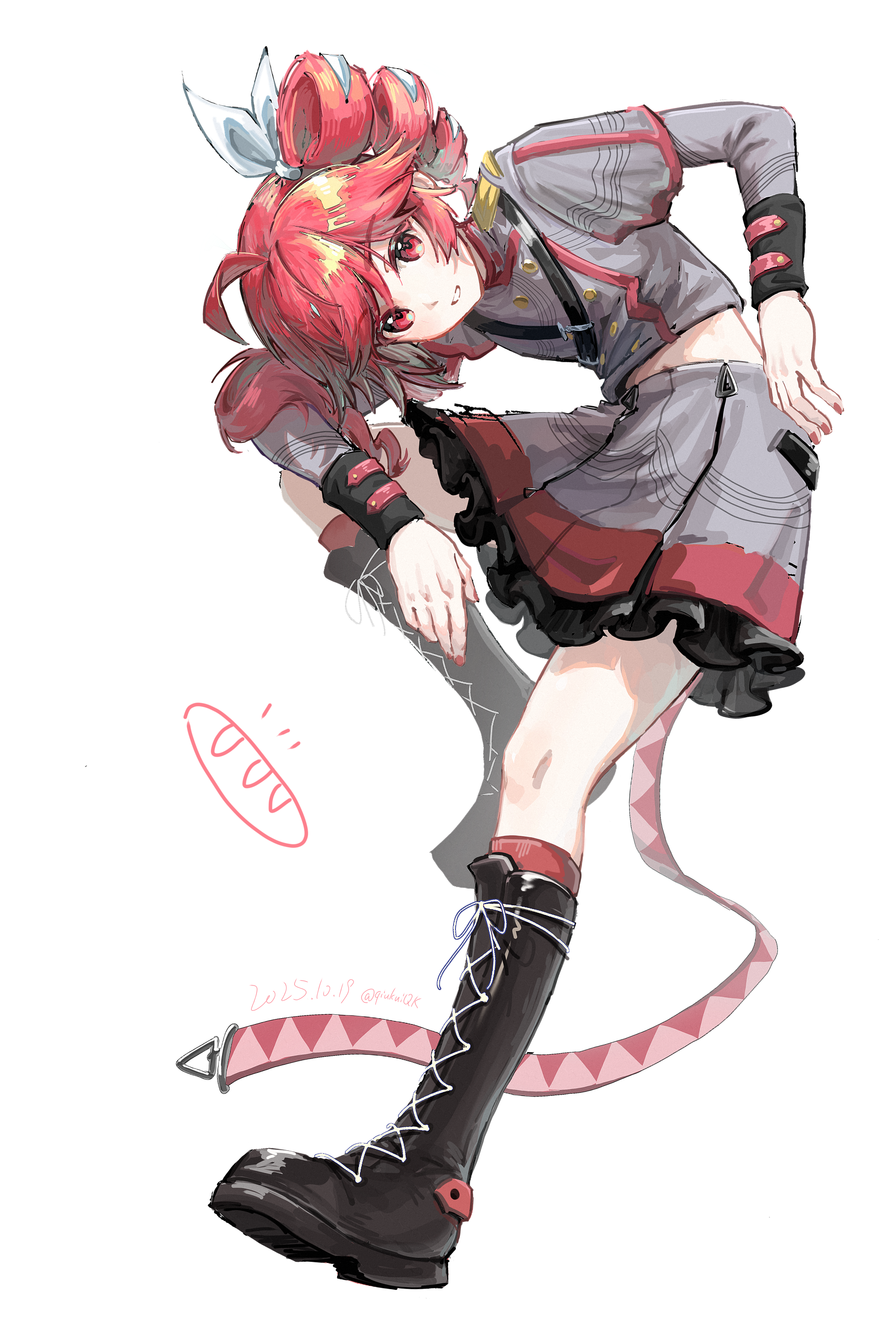 1girlahogeblack bootsbootsbuttonsdateddoodle insetdouble-breasteddrill hairgrey shirthair ribbonknee uplace-up bootsmidriffmusical staffmusical staff printnail polishparted lipsqiukuired eyesred hairred nailsribbonshirtshoulder beltsimple backgroundskirtsolotwin drillstwitter usernamewhite backgroundwhite ribbon