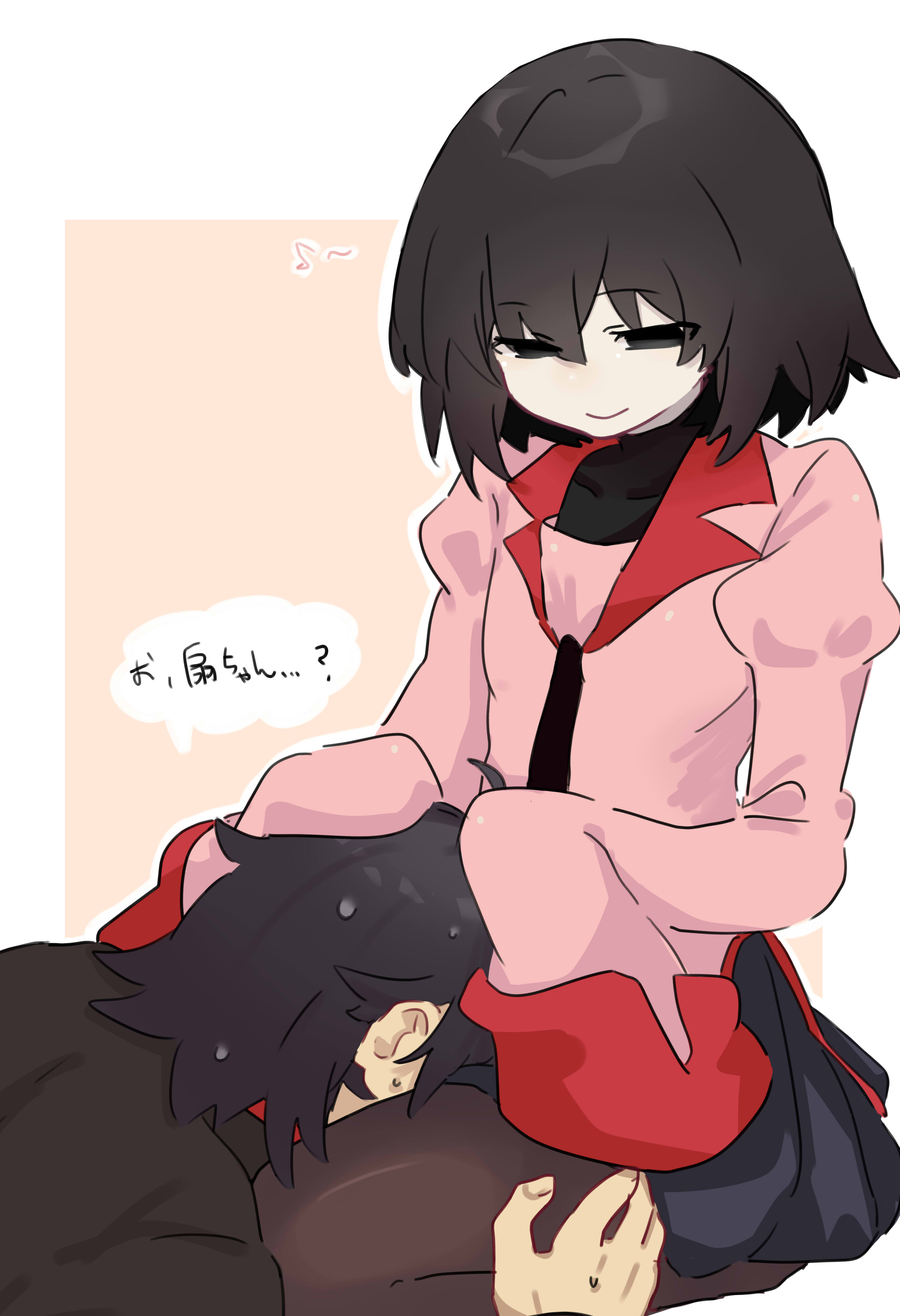 1boy1girlblack eyesblack hairblack jacketblack necktieblack pantyhoseblack shirtblack skirtbob cutbordercollared shirtdress shirtempty eyesface downface in crotchgakuranhair between eyeshands on another's headjacketjuliet sleeveslap pillowlight smilelong sleeveslyingmusical notenaoetsu high school uniformnarrowed eyesnecktieon groundon stomachopen mouthorange backgroundpale skinpantyhoseparted lipspink shirtpleated skirtpuffy sleevesred trimschool uniformseizashirtshort hairsimple backgroundsittingskirtsleeves past fingerssleeves past wristssmilespeech bubblespoken musical notesweatturtleneckvery long sleeveswhite border
