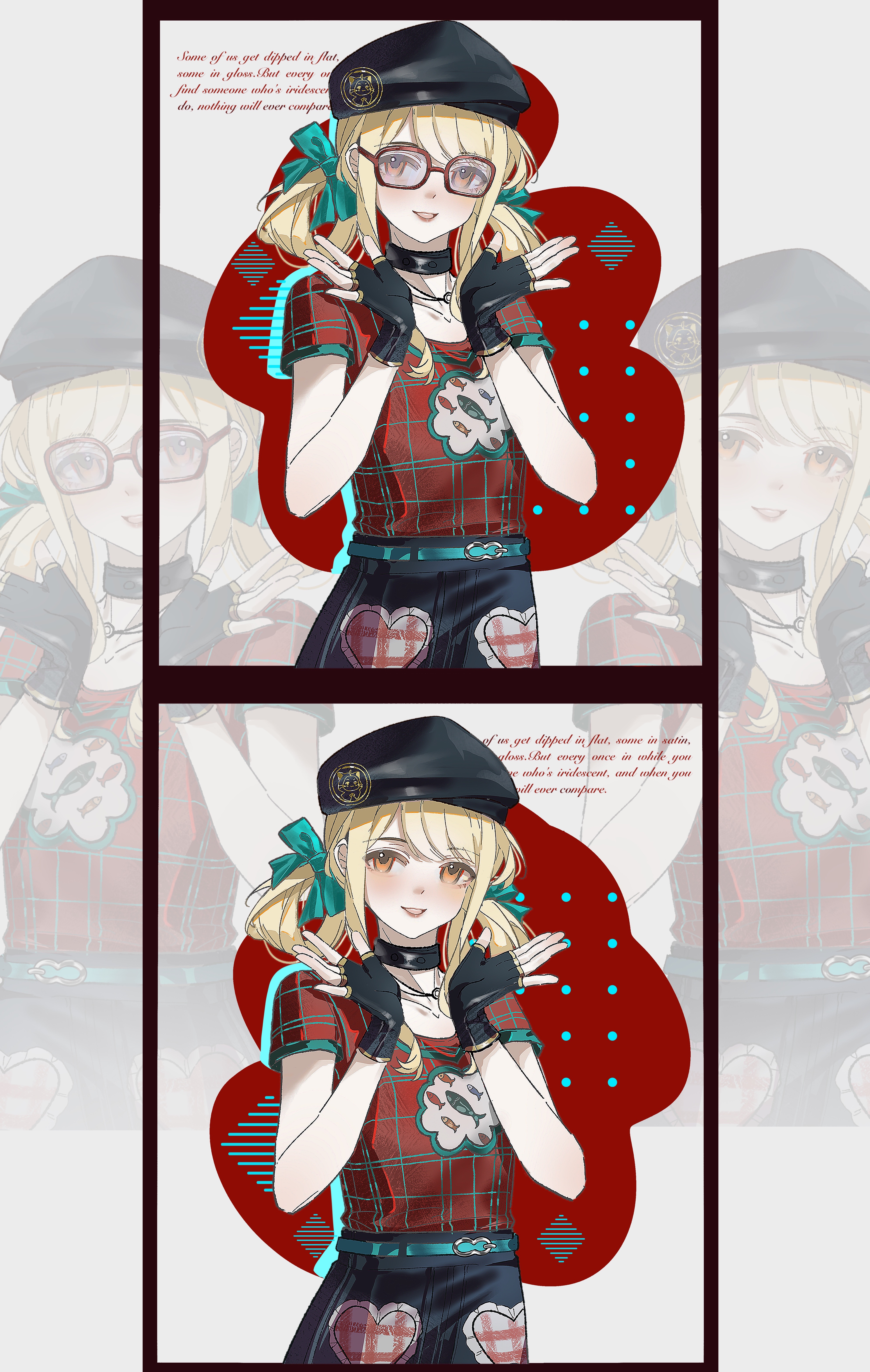 1girlanimal printaqua beltaqua bowbeltberetblack chokerblack glovesblack hatblonde hairblue skirtbowbrown eyeschokercollarbonecowboy shotdiamond (shape)dressdrop shadowenglish textfingerless glovesfish printglassesglovesgrey backgroundhair bowhair ringshalftonehappyhatheartheart printhigh-waist skirtlipstickmakeupopen mouthplaid clothesplaid dresspocketprint shirtred lipsred shirtred-framed eyewearshirtshort hair with long locksshort sleevessidelocksskirtsmilestandingstylist (nikki)t-shirtvariationszoom layer