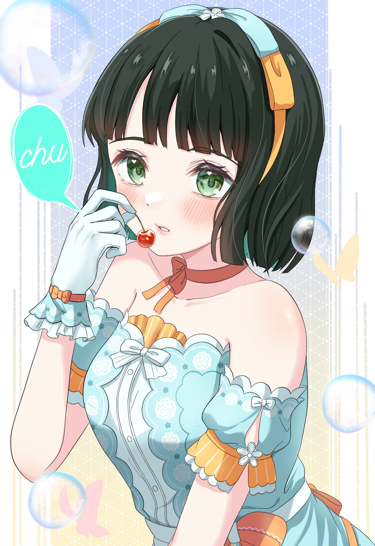 1girlarmpit creasebare shouldersblack hairblue backgroundblue dressblue ribbonblunt bangsblunt endsblushbob cutbow hairbandcelebration! (love live!)chokercolored speech bubbledetached sleevesdressgradient backgroundgreen eyeshair ribbonhairbandholding cherrylooking at viewerofficial alternate costumeorange chokerorange hairbandorange ribbonparted lipspuffy short sleevespuffy sleevesribbonribbon chokerromaji textshort hairshort sleevessolospeech bubblestraplessstrapless dressupper bodyvirtual youtuberyellow background