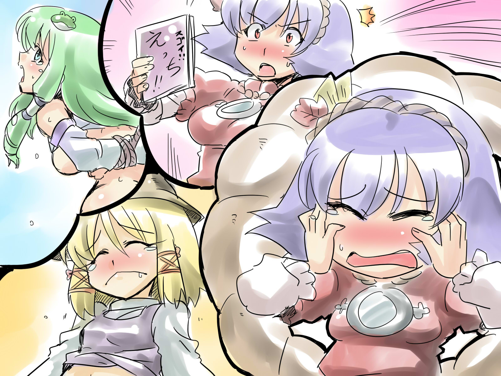 minase nayuki, sawatari makoto, tsukimiya ayu, kanon, argyle legwear, striped legwear, absurdres, highres, long image, wide image, 3girls, argyle clothes, bed, blonde hair, blue eyes, blue hair, brown eyes, brown hair, denim, denim jacket, food, hair ribbon, hairband, jacket, multiple girls, patterned legwear, ribbon, school uniform, serafuku, shorts, smile, socks, stuffed animal, stuffed toy, sweater, taiyaki, wagashi