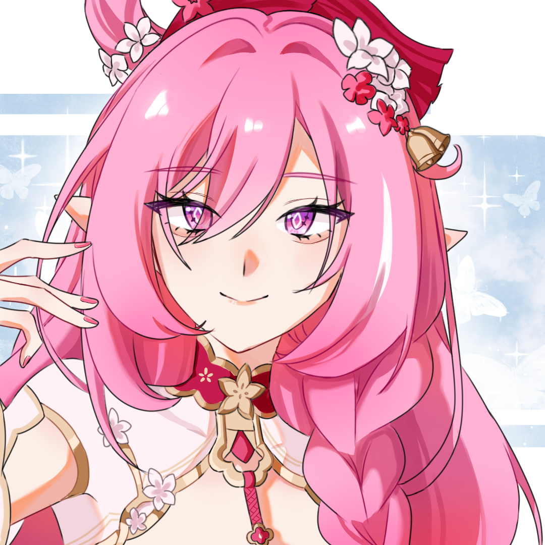 1girlbellbraidbreastselfflowerhair bellhair flowerhair ornamentlong hairlooking at viewerofficial alternate costumepink hairpink nailspointy earspurple eyessingle braidsmilesoloupper bodyvery long hair