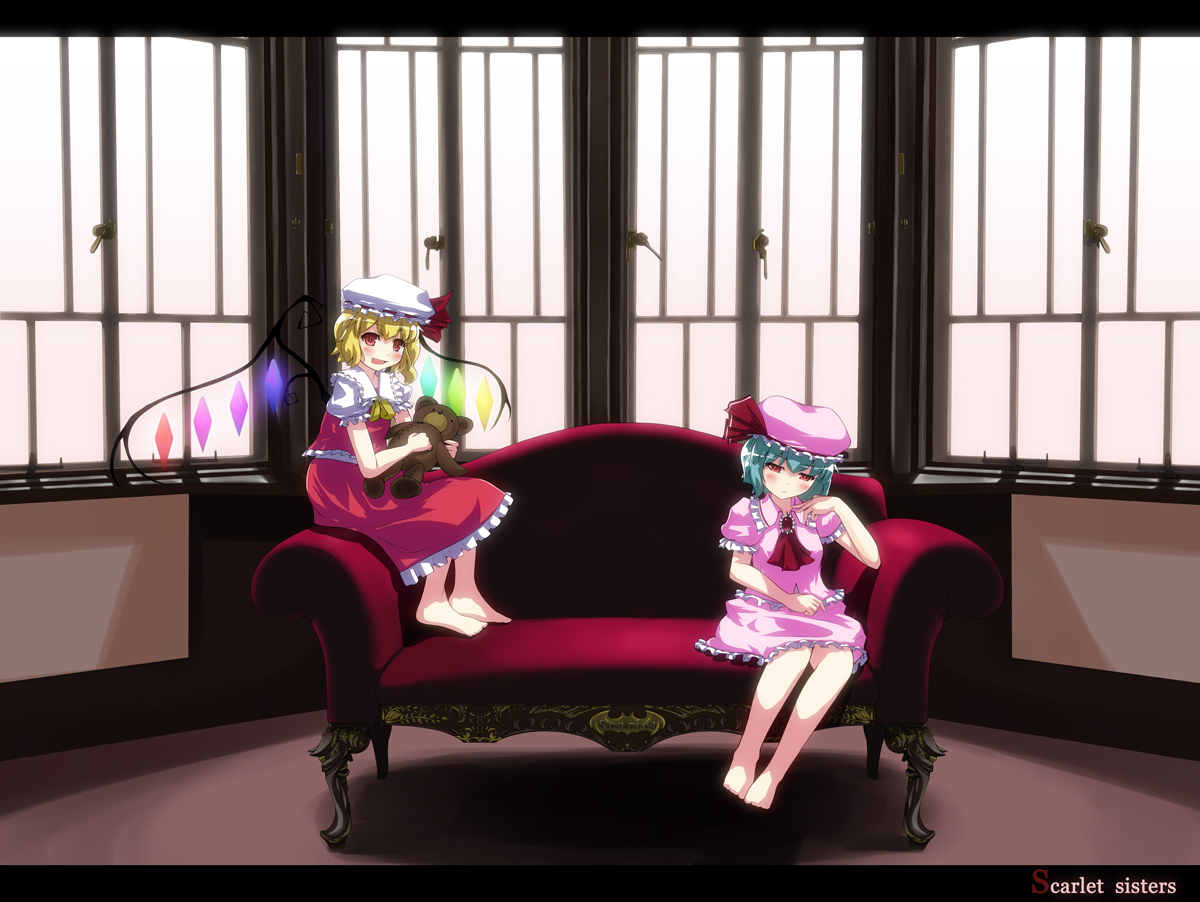 2girlsbarefootblonde hairblue haircouchfeetfemale focushatindoorsletterboxedmultiple girlsred eyesred upholsteryribbonsiblingssisterssittingstuffed animalstuffed toyteddy bearwindowwings