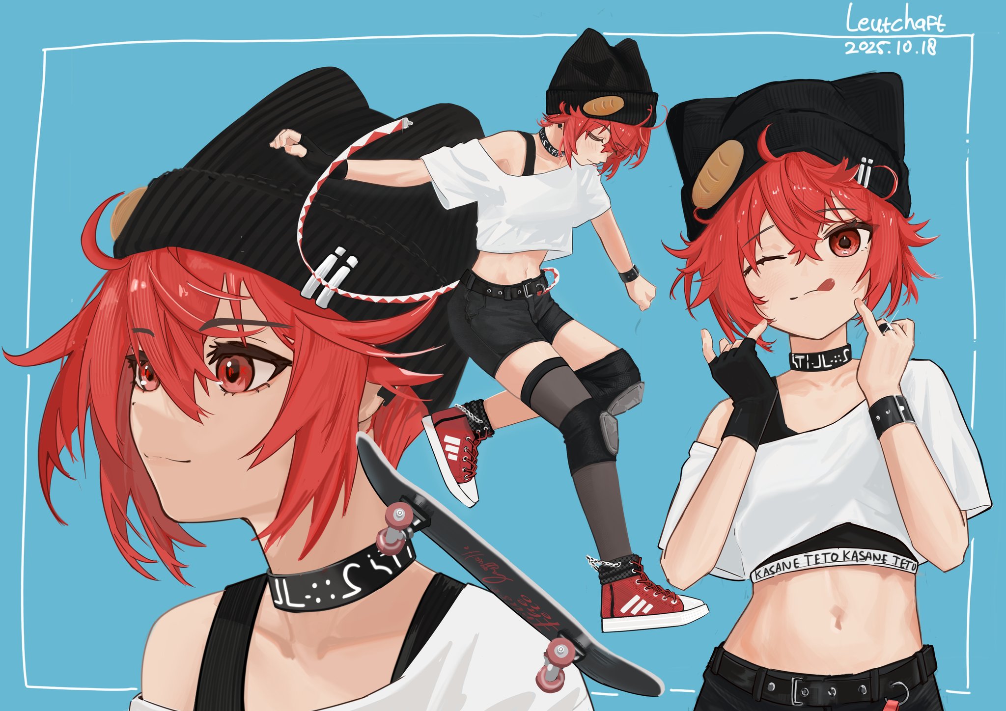 1girlalternate costumealternate hairstyleartist namebeaniebeltblack glovesblack hatblack shortsblack thighhighsblue backgroundbreastschokerclosed eyesclosed mouthdatedearclipfingerless glovesglintgloveshatjewelrykneepitsleutchaftmidriffmultiple viewsnavelone eye closedred eyesred hairred shoesringshirtshoesshort hairshort sleevesshortssingle bare shouldersingle glovesingle thighhighskateboardsmall breastssneakerssports brathighhighstonguetongue outwhite shirtwristband