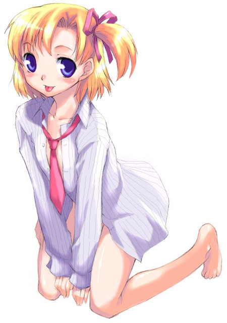 :p00s1girlbarefootblonde hairblue eyesblushbottomlessfeetfemale focusfull bodygenderswapgenderswap (mtf)jacketkneelinglegsnaked shirtnecktieribbonshirtshort hairside ponytailsimple backgroundsolotonguetongue outwhite background