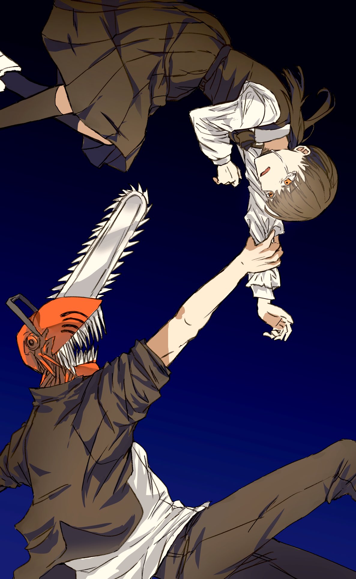 1boy1girlblack dressblack hairblack jacketblack pantsblue backgroundbrown eyeschainsawcollared shirtcryingdressfeet out of frameholding another's armjacketlow twintailsopen mouthpantspinafore dressschool uniformsharp teethshirtsleevelesssleeveless dresssleeves rolled uptearsteethtwintailswhite shirt