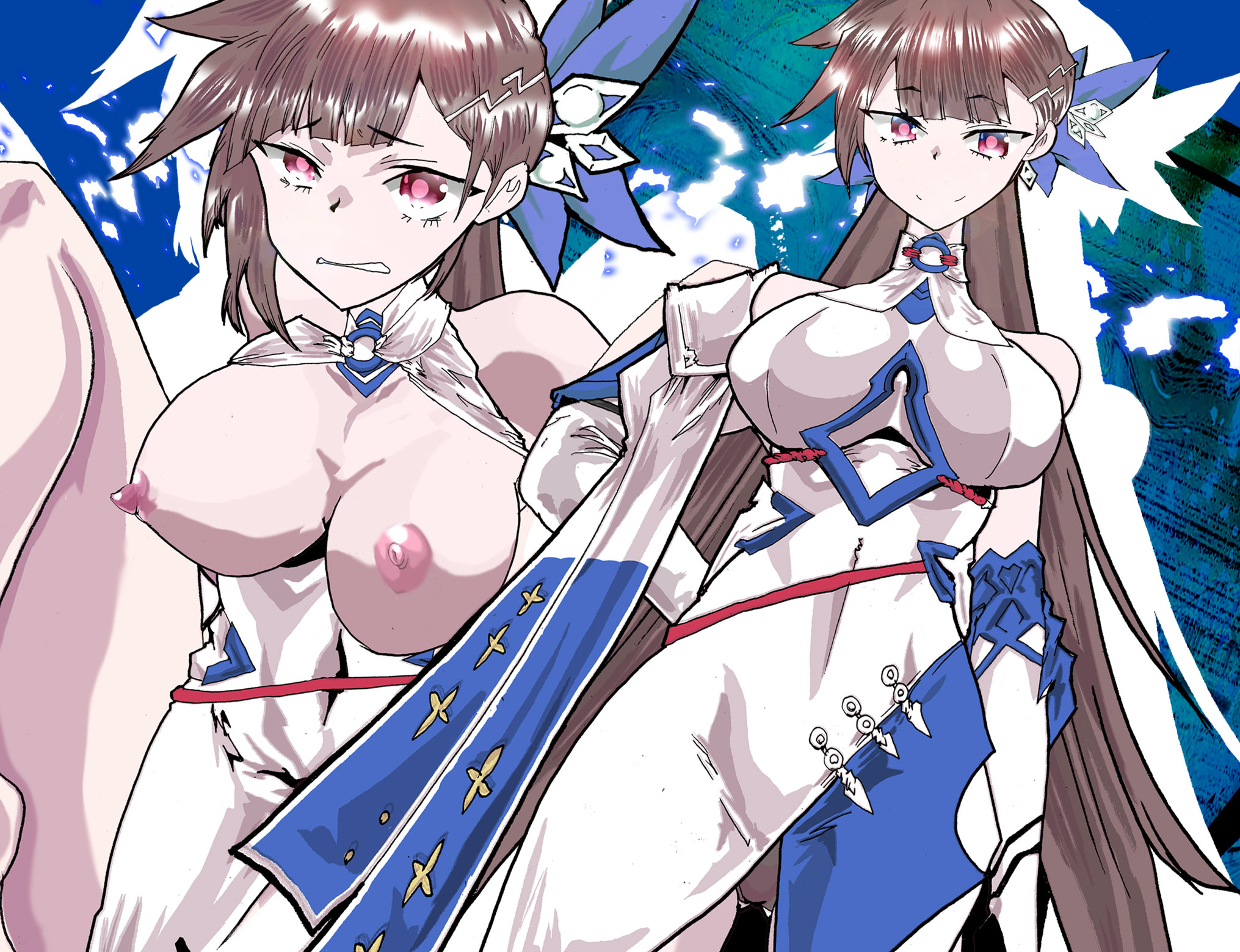1girlarm behind backbare shouldersbreastsbreasts outbrown eyesbrown haircleavageclosed mouthcowboy shotdresselbow glovesfingerless glovesgloveshair ornamentlarge breastslong hairlooking at viewermultiple viewsnipplesparted lipsred eyessmilestandingvery long hairwhite dresswhite gloves