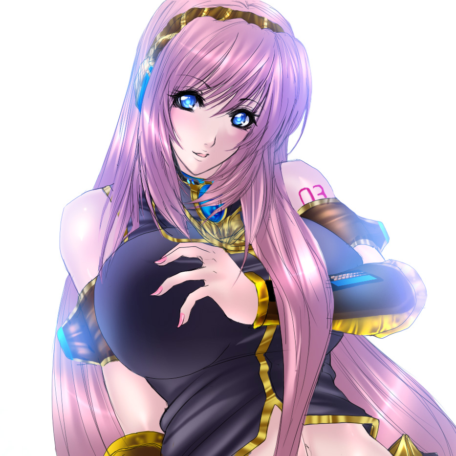 1girlblue eyesblushbreastsfemale focusfingernailsgrabbing another's breastgropingheadsetholdinghuge breastslong fingernailslong hairmidriffnail (hardware)nail polishnaughty facepink hairpink nailssmilesolo