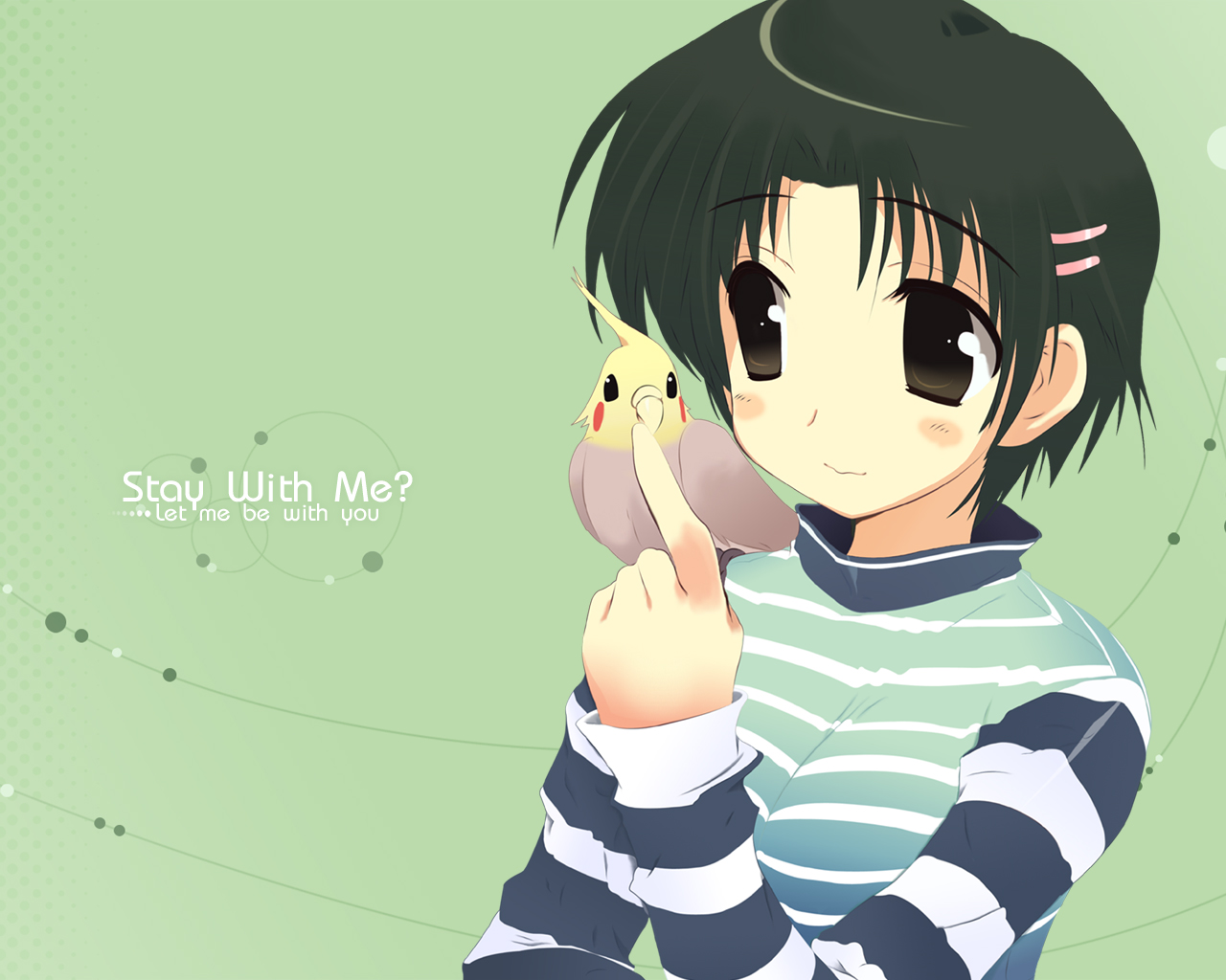 1girlanimalanimal on shoulderbirdbird on shoulderblack haircockatielfemale focusshirtshort hairsolostriped clothesstriped shirt