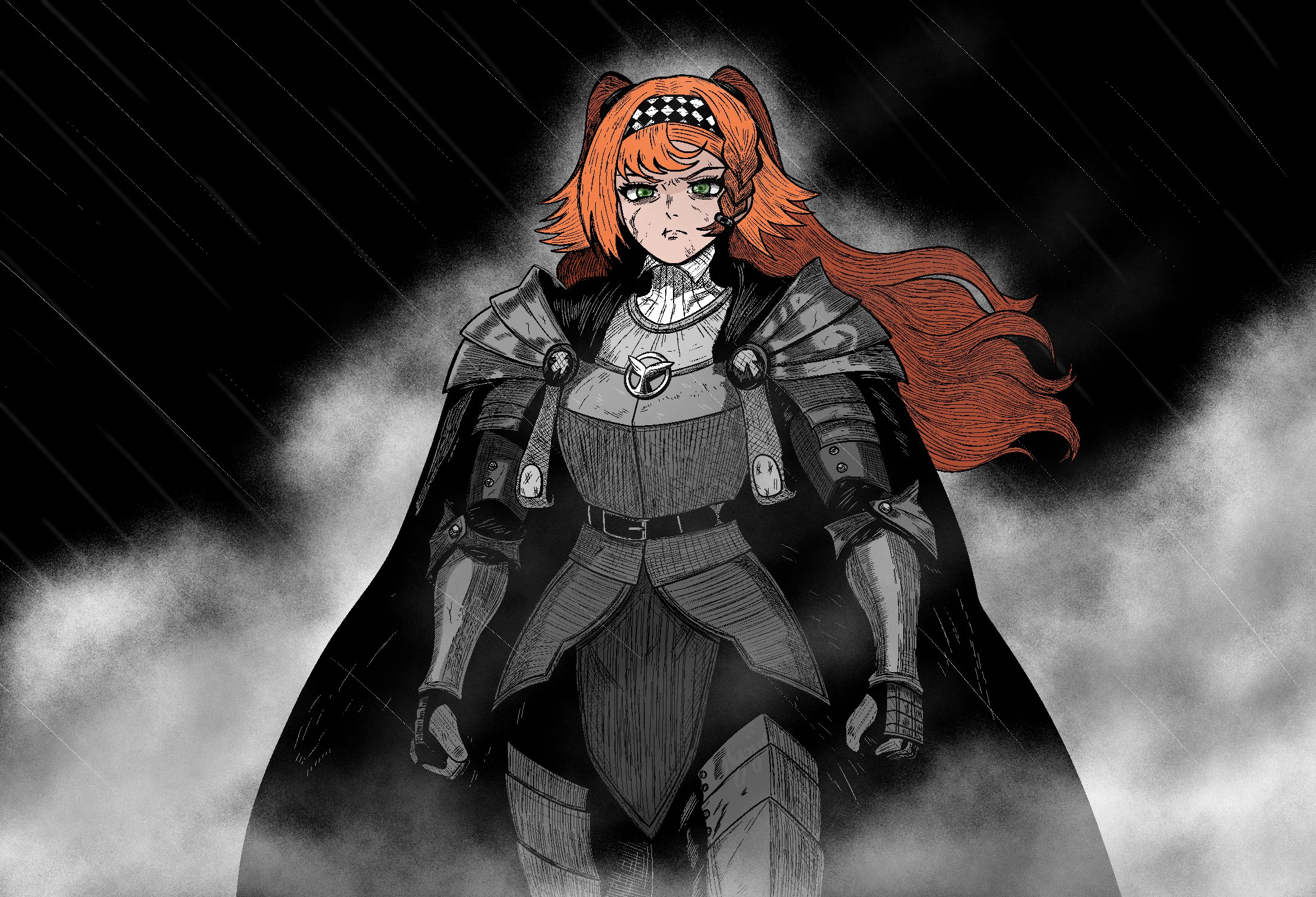 1girlalternate costumearmorblack backgroundblack capebreastplatecapecheckered hairbandclosed mouthcowboy shotcuissesfauldsgauntletsgreen eyeshairbandlooking at viewerrainscarscar on faceshoulder armorsmokesolotwo side upv-shaped eyebrows