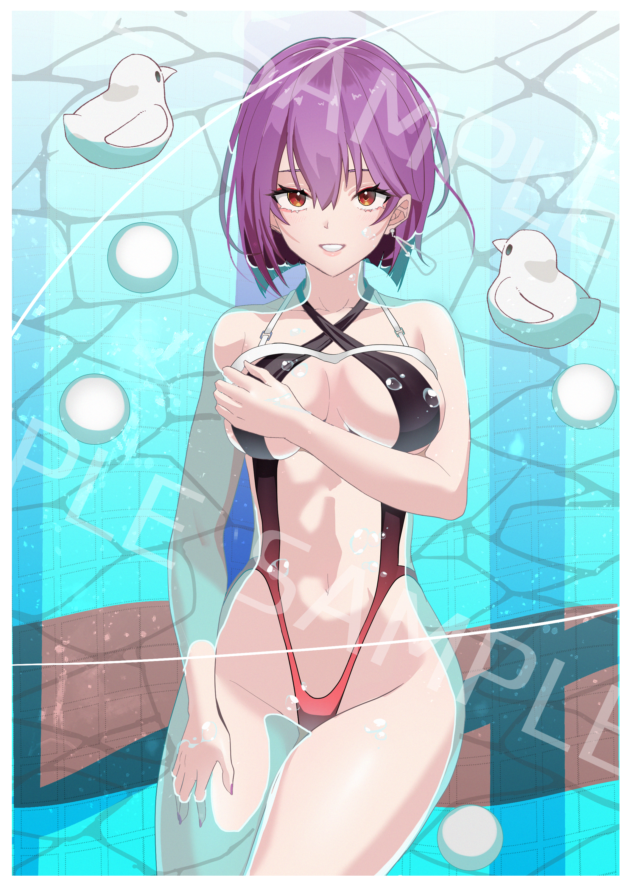 1girlafloatbare shouldersbirdblack one-piece swimsuitbreastscowboy shotcriss-cross halterearringsgrinhair between eyeshalterneckhighlegjewelrylarge breastslooking at viewermedium breastsnail polishnavelone-piece swimsuitorange eyespartially submergedpoolpurple hairpurple nailsred eyessample watermarkshort hairsingle earringslingshot swimsuitsmilesoloswimsuitthighswaterwatermark