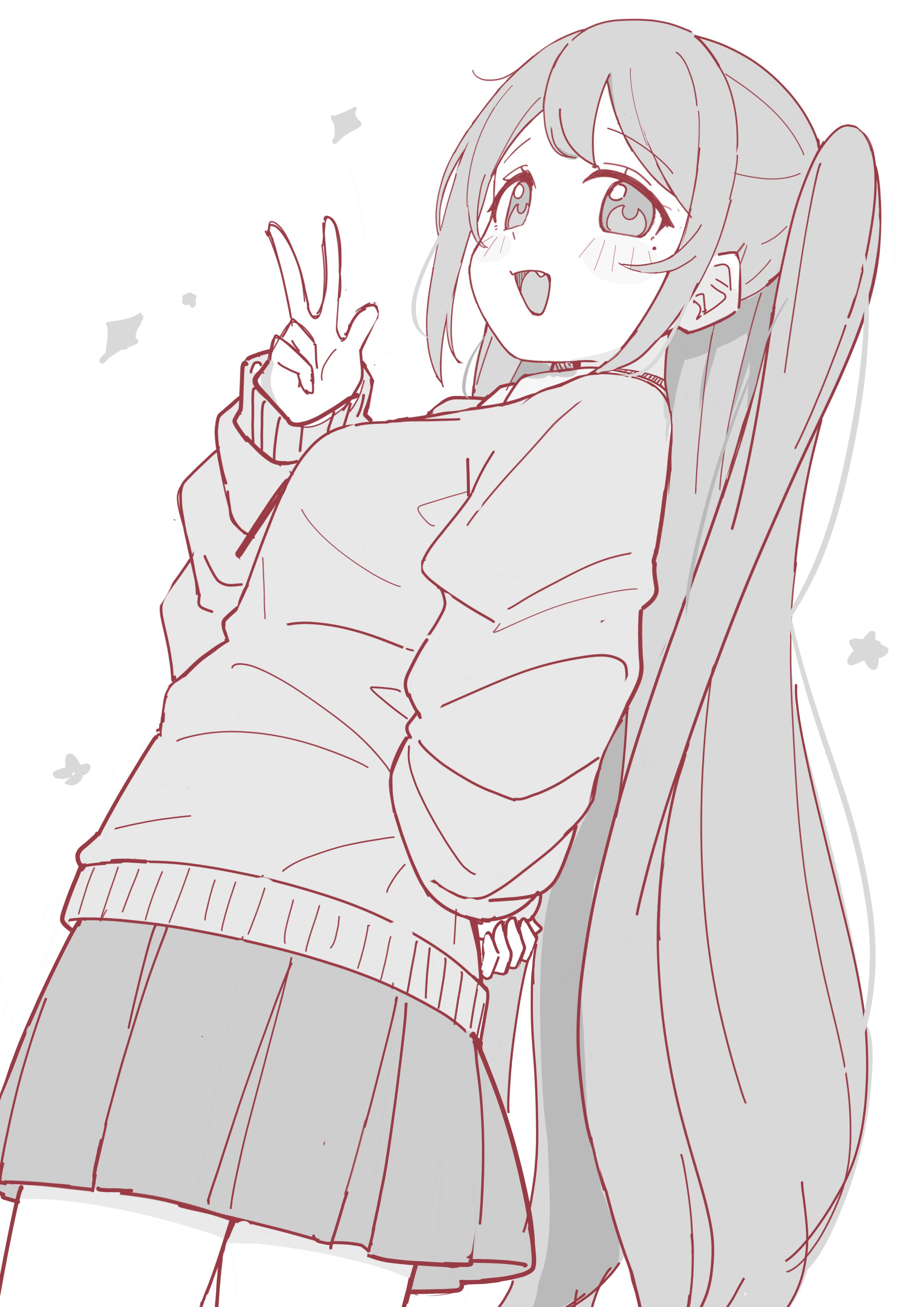 :d1girlarm upblush stickersbreastsfangfrom sidegreyscalelong hairlong sleevesmonochromeone side upopen mouthpleated skirtpuffy long sleevespuffy sleevesschool uniformsimple backgroundskirtsleeves past wristssmall breastssmilesolosweatervery long hairwhite background