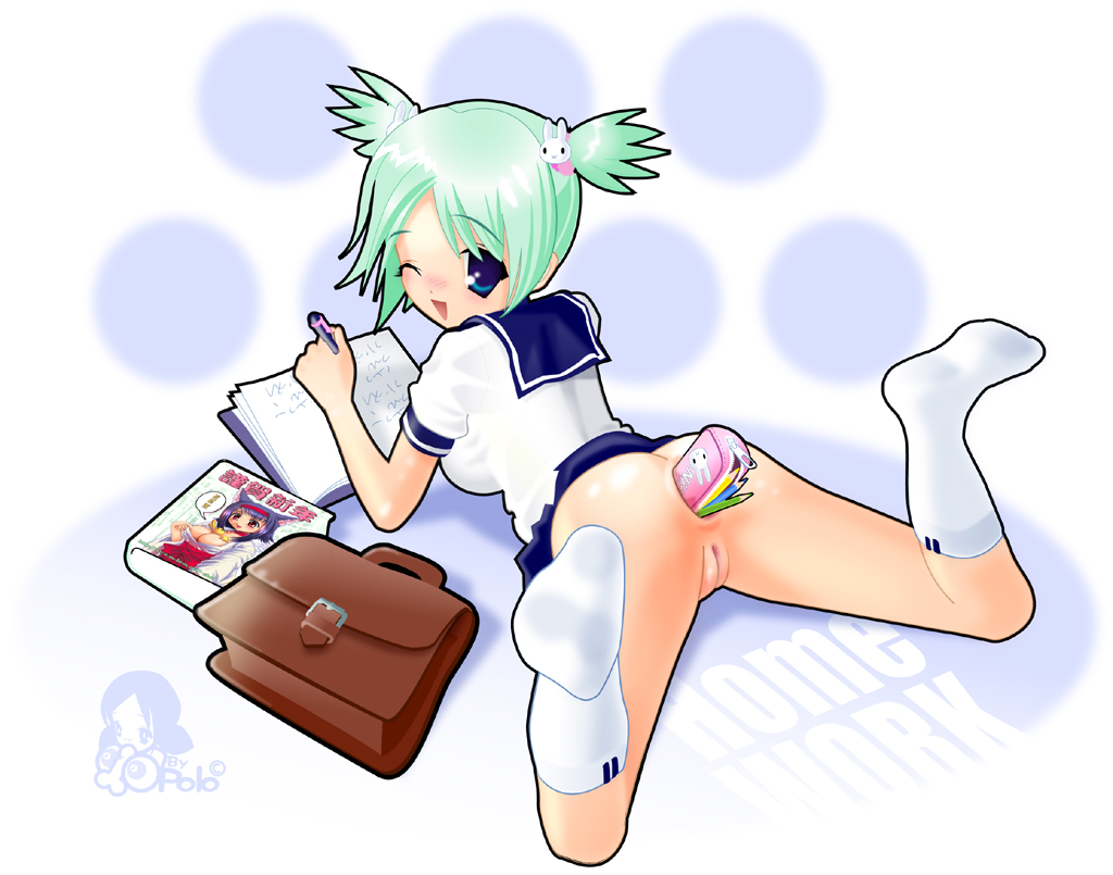 1girlanalanal object insertionanusassbagblue eyesblushbookbreastscleft of venusclothes liftfemale focusgreen hairhomeworklarge breastslooking at viewerlooking backlyingno pantiesnotebookobject insertionon stomachone eye closedpencil casepencilcasepussyschool uniformserafukushort hairsignatureskirtskirt around bellyskirt liftsmilesockssolospread legstwintailsuncensoredwink