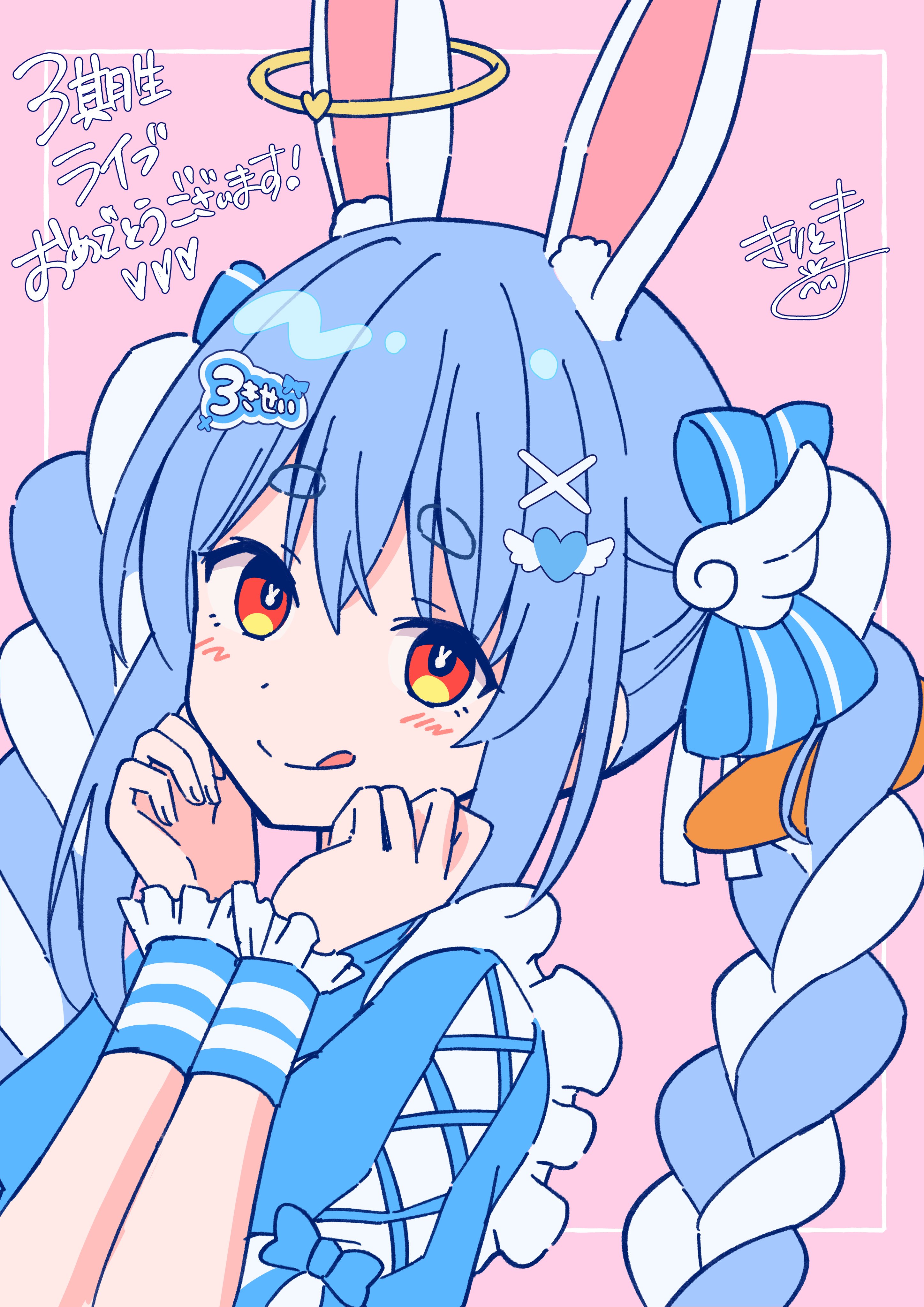 :q1girlanimal ear fluffanimal earsblue bowblue hairblushbowbraidcarrot hair ornamentclosed mouthfood-themed hair ornamentfrillshair bowhair ornamenthands upheartheart hair ornamentlooking at viewermulticolored hairpink backgroundrabbit earsrabbit girlrabbit-shaped pupilsred eyesshort eyebrowssignaturesmilesolosymbol-shaped pupilsthick eyebrowstonguetongue outtwin braidstwintailstwo-tone hairupper bodyvirtual youtuberwhite hairwrist cuffsx hair ornament