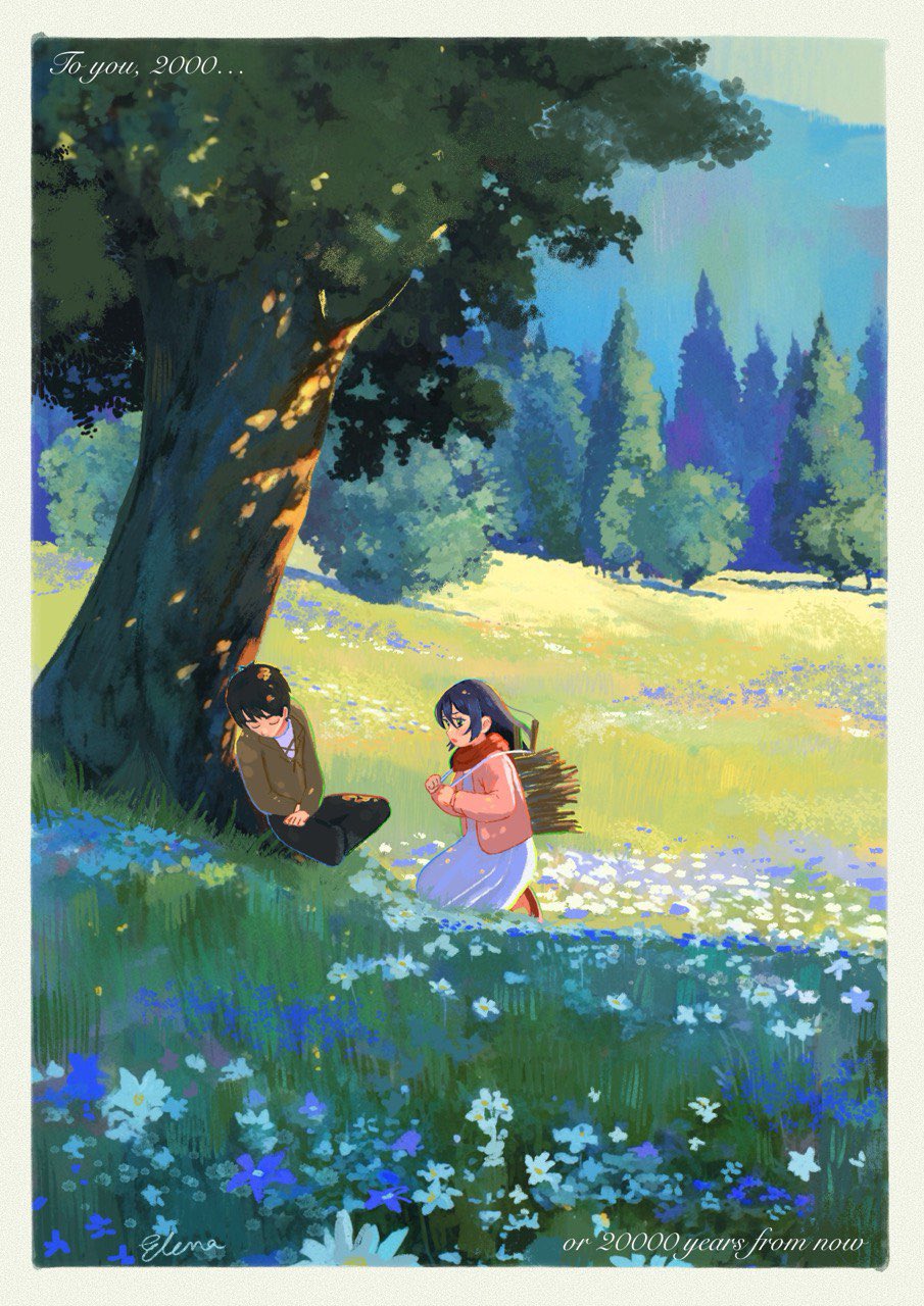1boy1girlblack hairblack pantsblue flowerbordercardiganclosed eyesdresselemolienglish textflowerforget-me-not (flower)grey shirthair between eyeskneelinglong hairnatureoutdoorspantspink cardiganred scarfscarfshirtshort hairsittingsleepingtreeunder treewhite borderwhite dresswhite flower