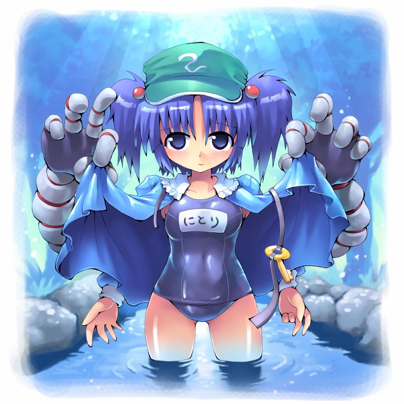 1girlblue eyesblue hairblushcharacter namefemale focushair bobbleshair ornamenthatmatching hair/eyesmechanical armsno pantsone-piece swimsuitopen clothesschool swimsuitsingle mechanical armsoloswimsuitswimsuit under clothestwintailstwo side upwater
