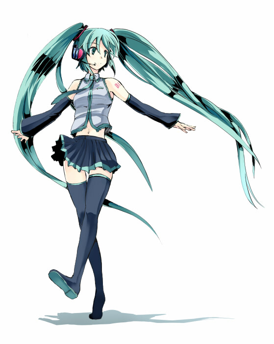 1girlaqua eyesaqua hairbare shouldersdetached sleevesfemale focusheadsetlong hairmidriffnavelnecktiesmilesolostandingstanding on one legthighhighstwintailsvery long hairzettai ryouiki